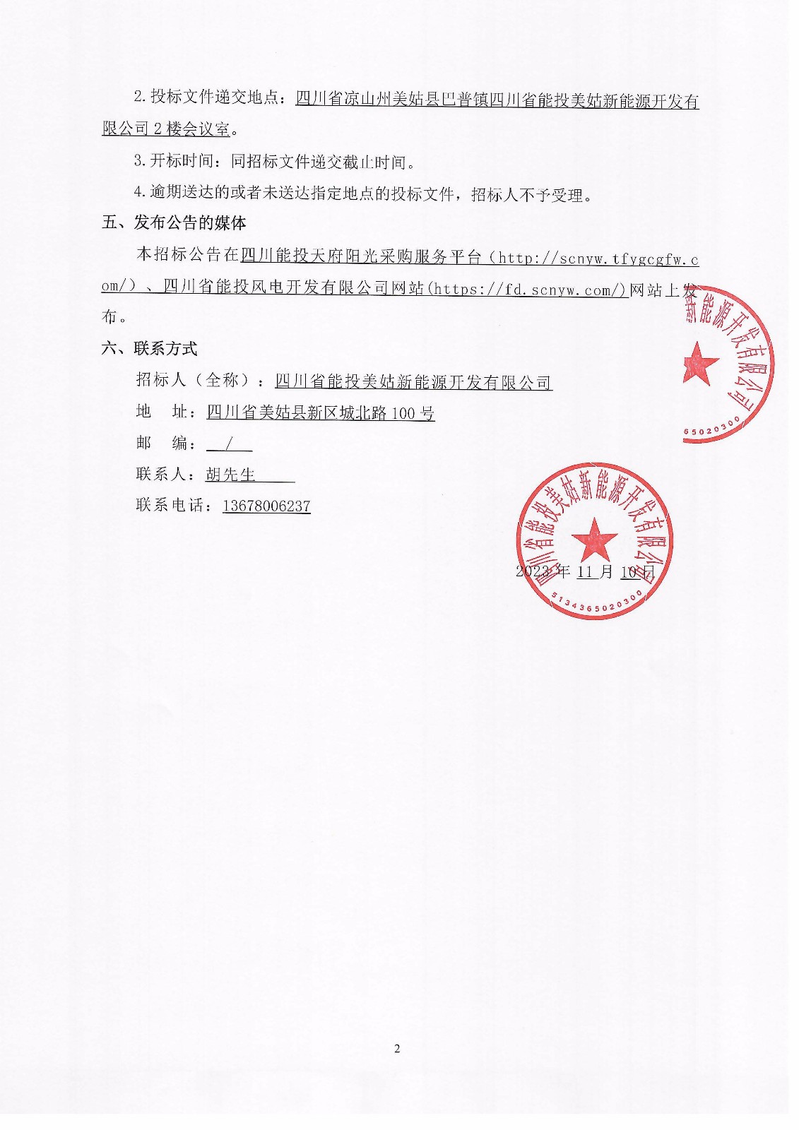 2.投标文件递交地点:四川省凉山州美姑县巴普镇四川省能投美姑新能源开发有限公司2楼会议室。