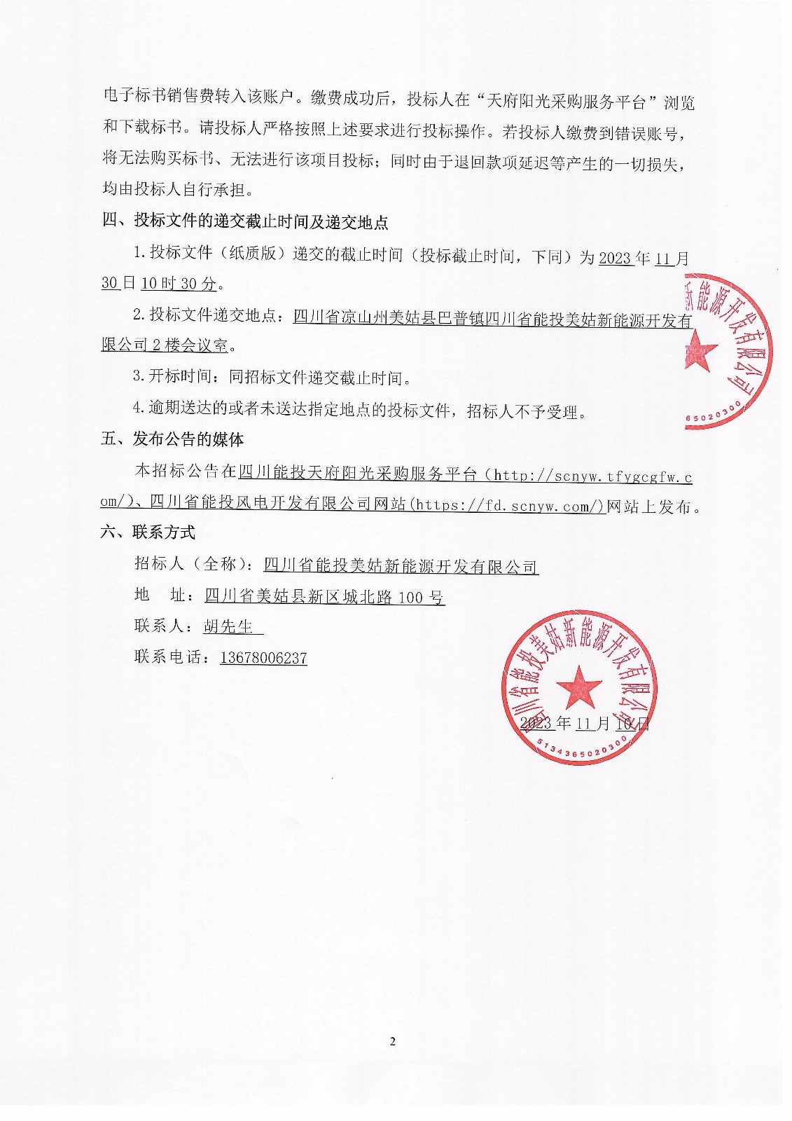 2.投标文件递交地点:四川省凉山州美姑县巴普镇四川省能投美姑新能源开发有限公司2楼会议室。
