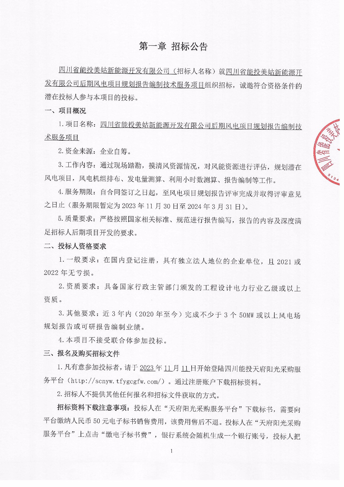 四川省能投美姑新能源开发有限公司(招标人名称)就四川省能投美姑新能源开发有限公司后期风电项目规划报告编制技术服务项目组织招标,诚邀符合资格条件的潜在投标人参与本项目的投标。