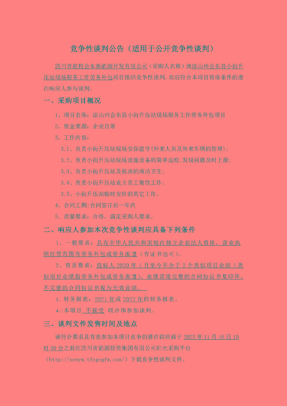 四川省能投会东新能源开发有限公司(采购人名称)就凉山州会东县小街升压站现场服务工作劳务外包项目组织竞争性谈判,欢迎符合本项目资格条件的潜在响应人参与谈判。