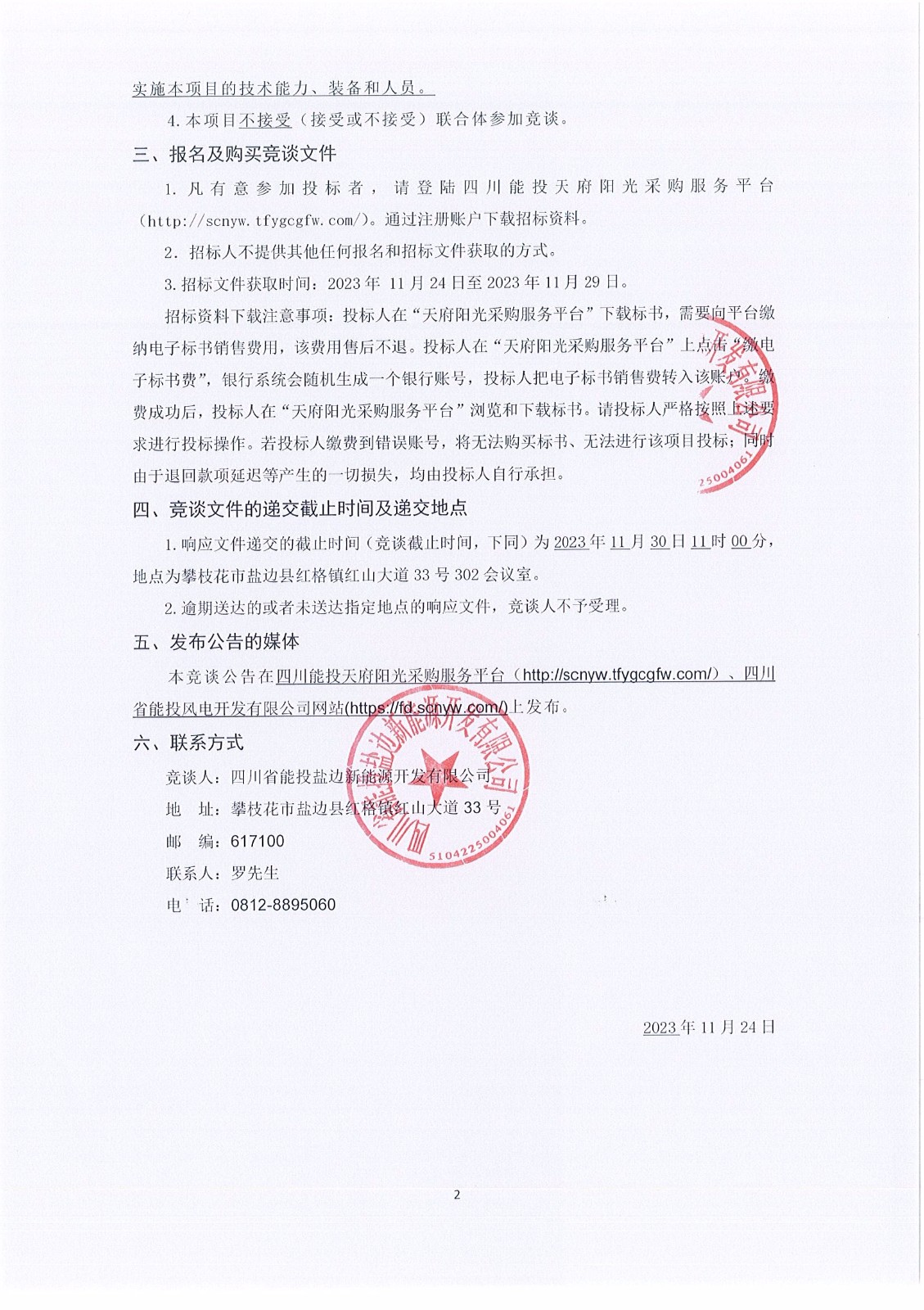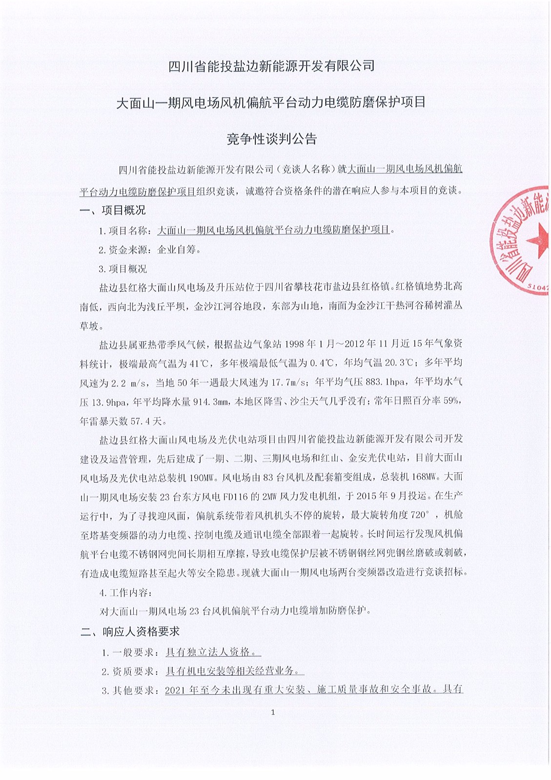 四川省能投盐边新能源开发有限公司(竞谈人名称)就大面山一期风电场风机偏航平台动力电缆防磨保护项目组织竞谈,诚邀符合资格条件的潜在响应人参与本项目的竞谈。