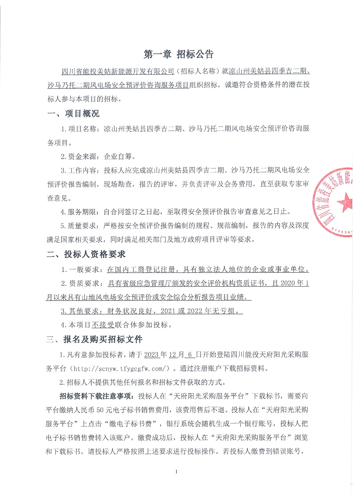 四川省能投美姑新能源开发有限公司(招标人名称)就凉山州美姑县四季吉二期、沙马乃托二期风电场安全预评价咨询服务项目组织招标,诚邀符合资格条件的潜在投标人参与本项目的招标。