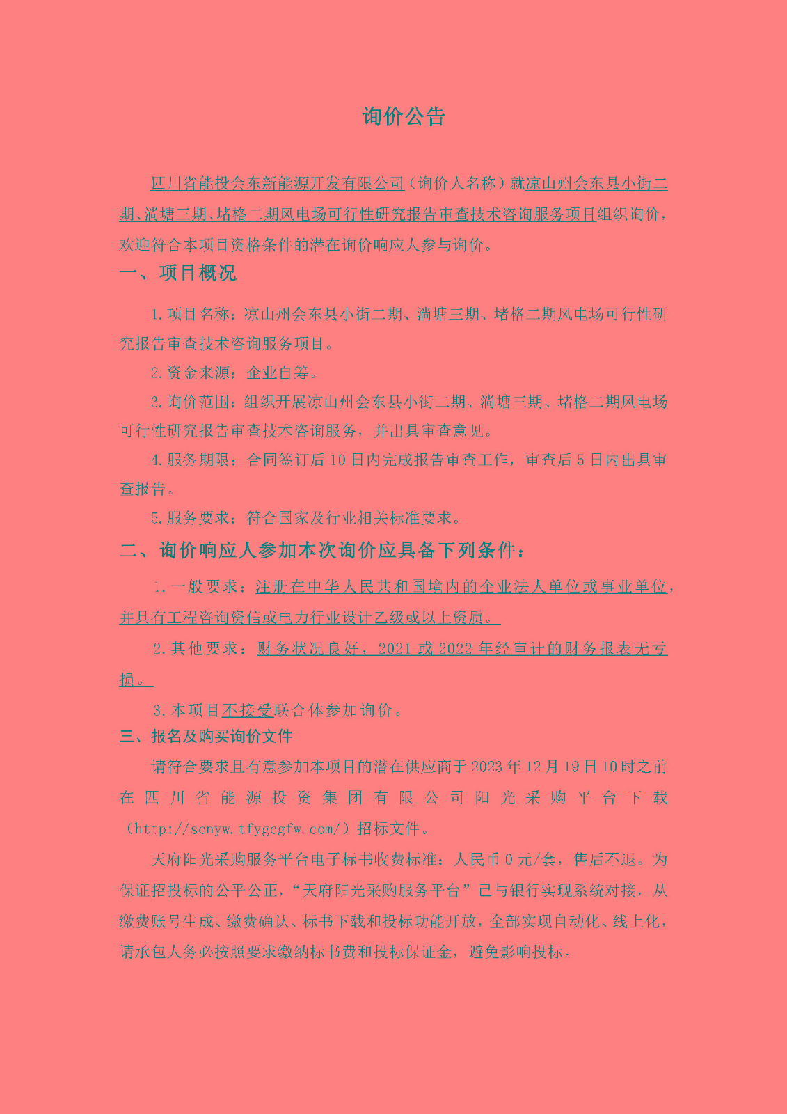 四川省能投会东新能源开发有限公司(询价人名称)就凉山州会东县小街二期、淌塘三期、堵格二期风电场可行性研究报告审查技术咨询服务项目组织询价,欢迎符合本项目资格条件的潜在询价响应人参与询价。