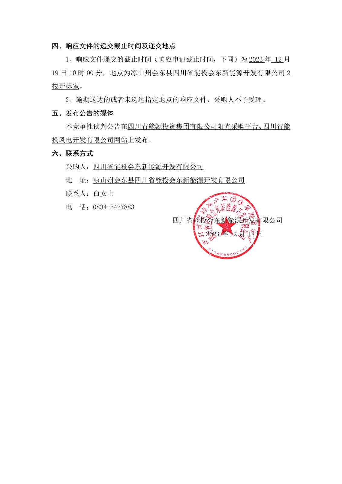 1、响应文件递交的截止时间(响应申请截止时间,下同)为2023年 12月19日10时00分,地点为凉山州会东县四川省能投会东新能源开发有限公司2楼开标室。