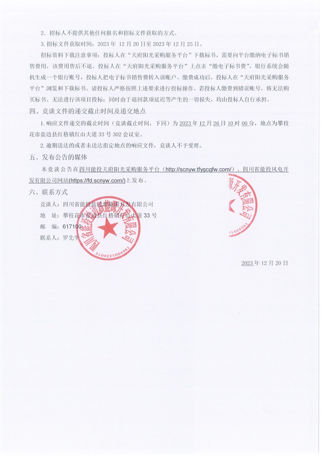 四川省能投盐边新能源开发有限公司(竞谈人名称)就大面山一期风电场两台变频器改造项目(第三次)组织竞谈,诚邀符合资格条件的潜在响应人参与本项目的竞谈。