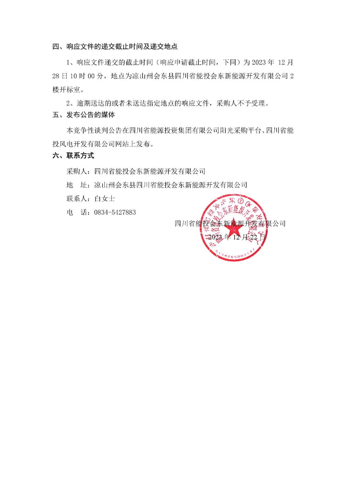 1、响应文件递交的截止时间(响应申请截止时间,下同)为2023年 12月28日10时00分,地点为凉山州会东县四川省能投会东新能源开发有限公司2楼开标室。
