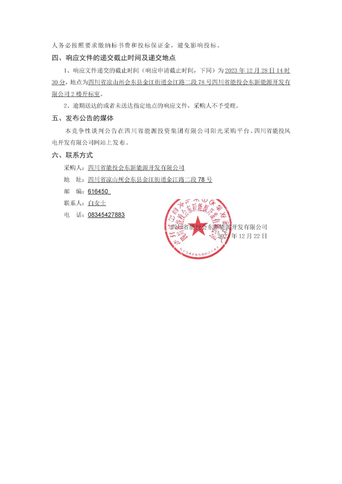 1、响应文件递交的截止时间(响应申请截止时间,下同)为2023年12月28日14时30分,地点为四川省凉山州会东县金江街道金江路二段78号四川省能投会东新能源开发有限公司2楼开标室。