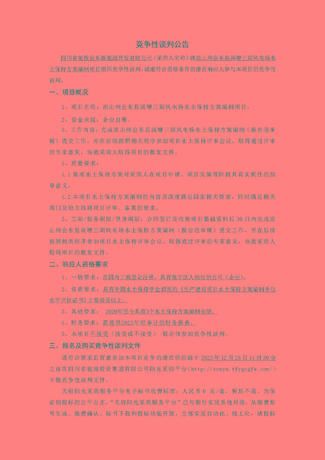 四川省能投会东新能源开发有限公司(采购人名称)就凉山州会东县淌塘三期风电场水土保持方案编制项目组织竞争性谈判,诚邀符合资格条件的潜在响应人参与本项目的竞争性谈判。