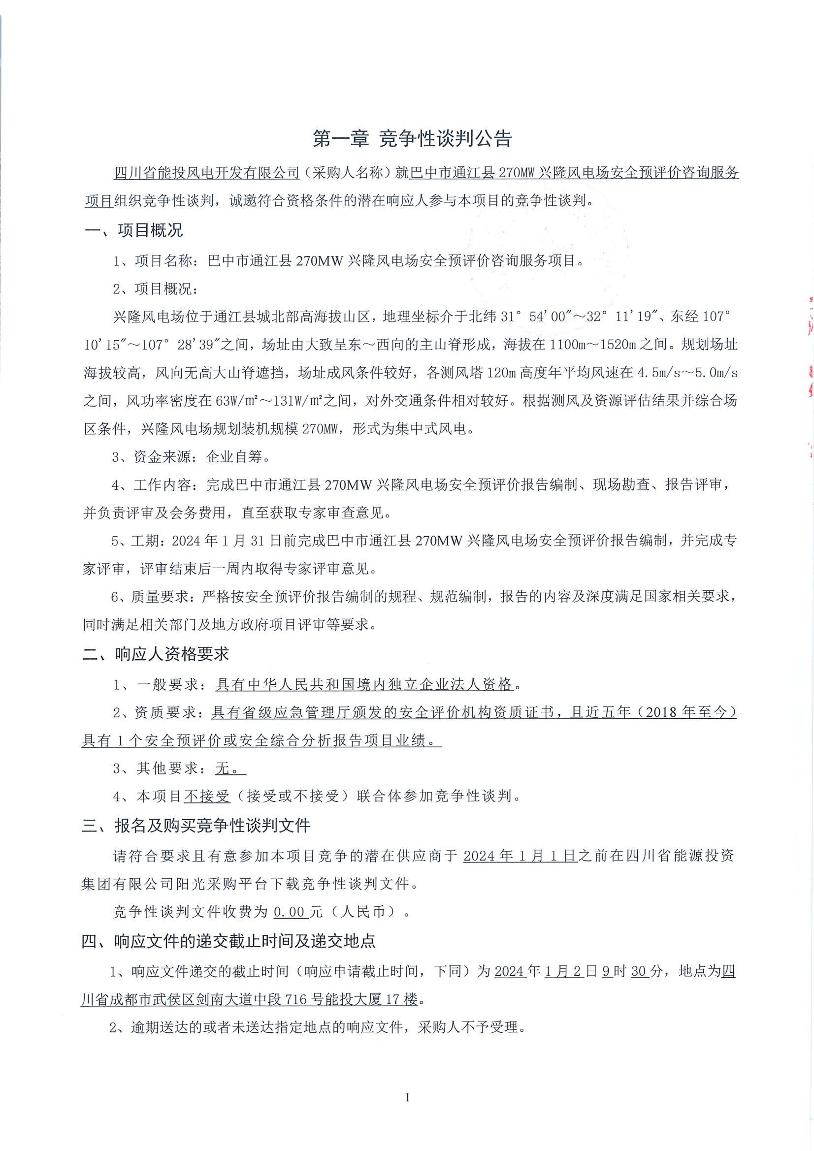 1、项目名称:巴中市通江县270MW兴隆风电场安全预评价咨询服务项目。