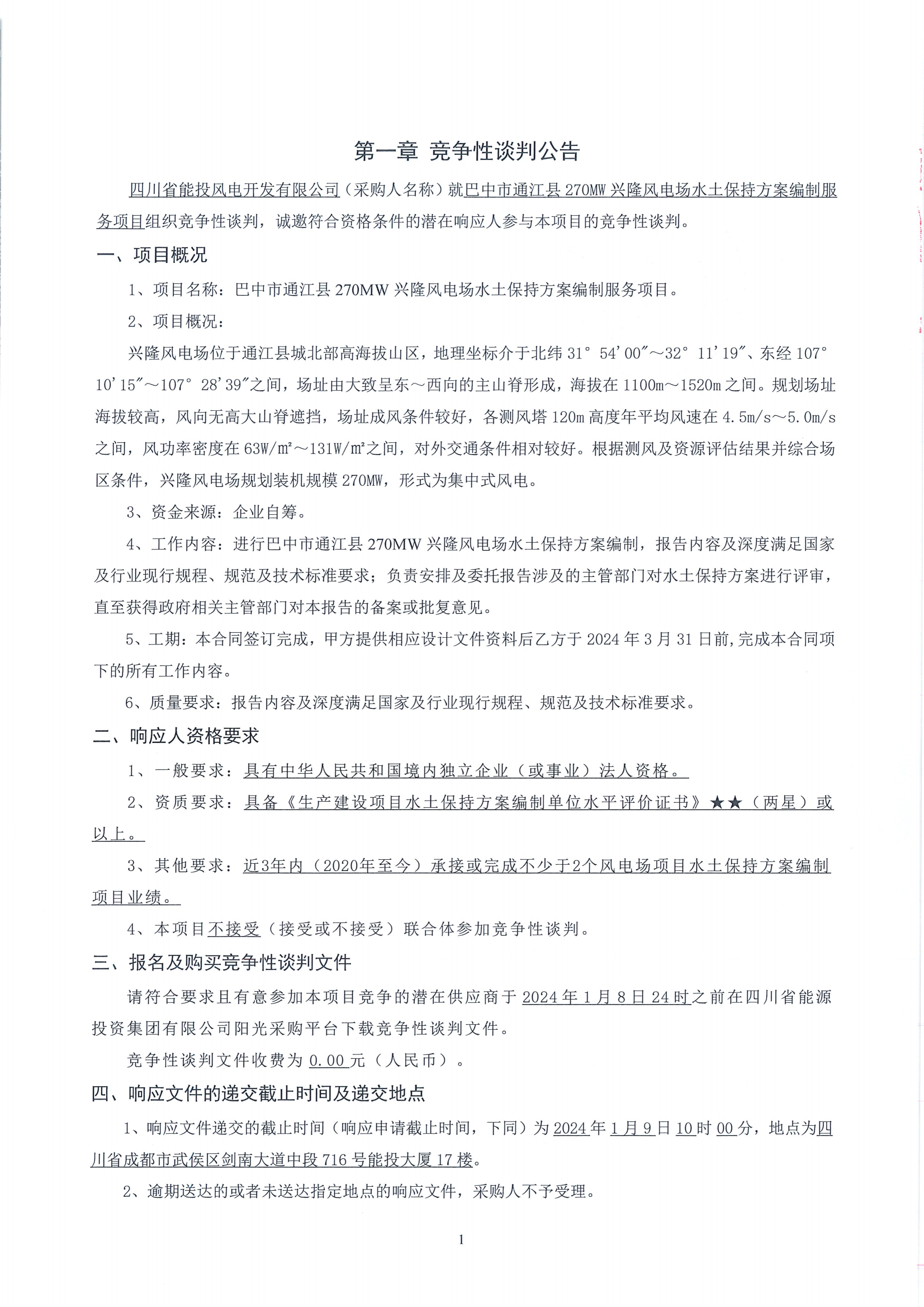 1、项目名称:巴中市通江县270MW兴隆风电场环境影响评价报告编制服务项目。