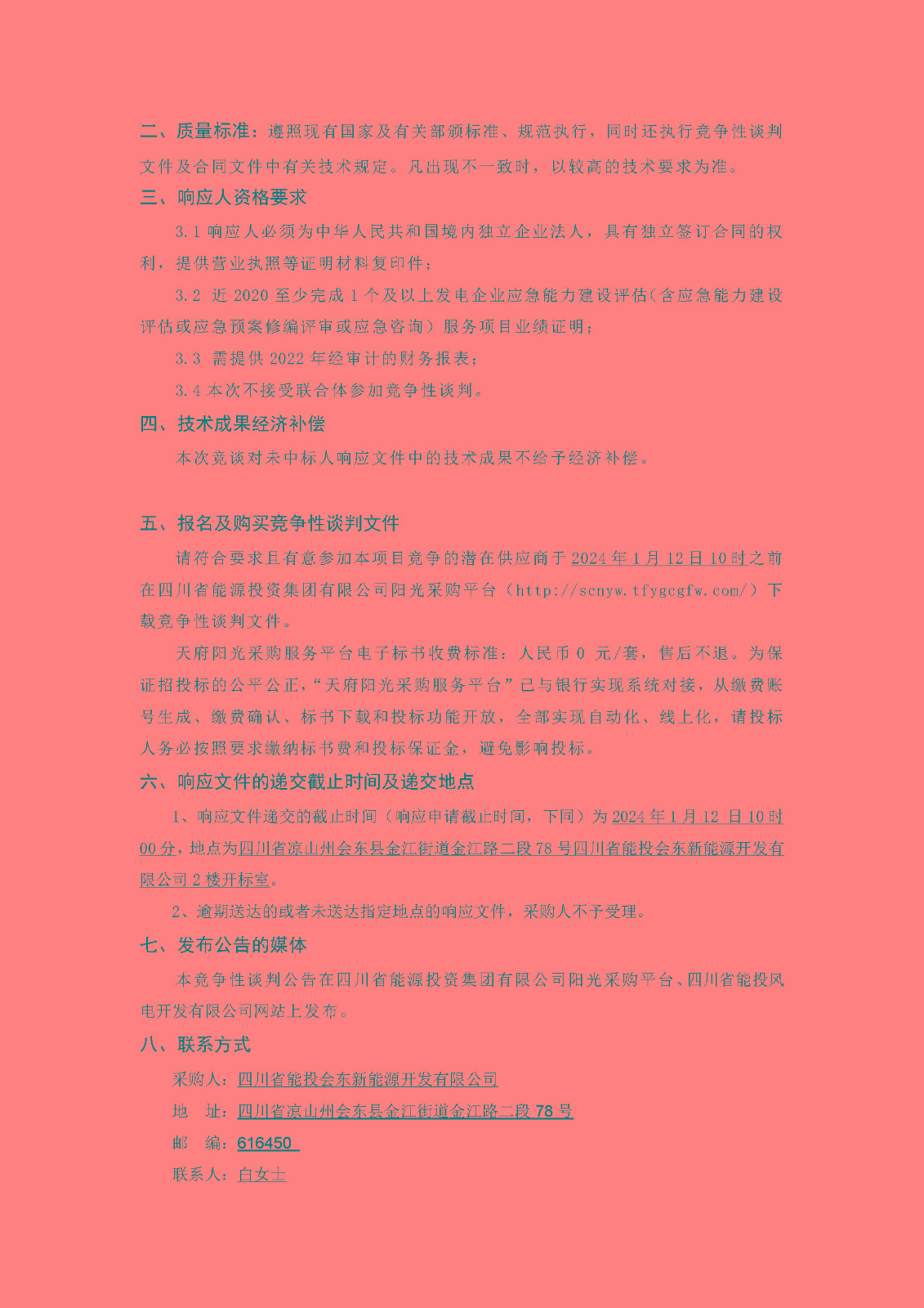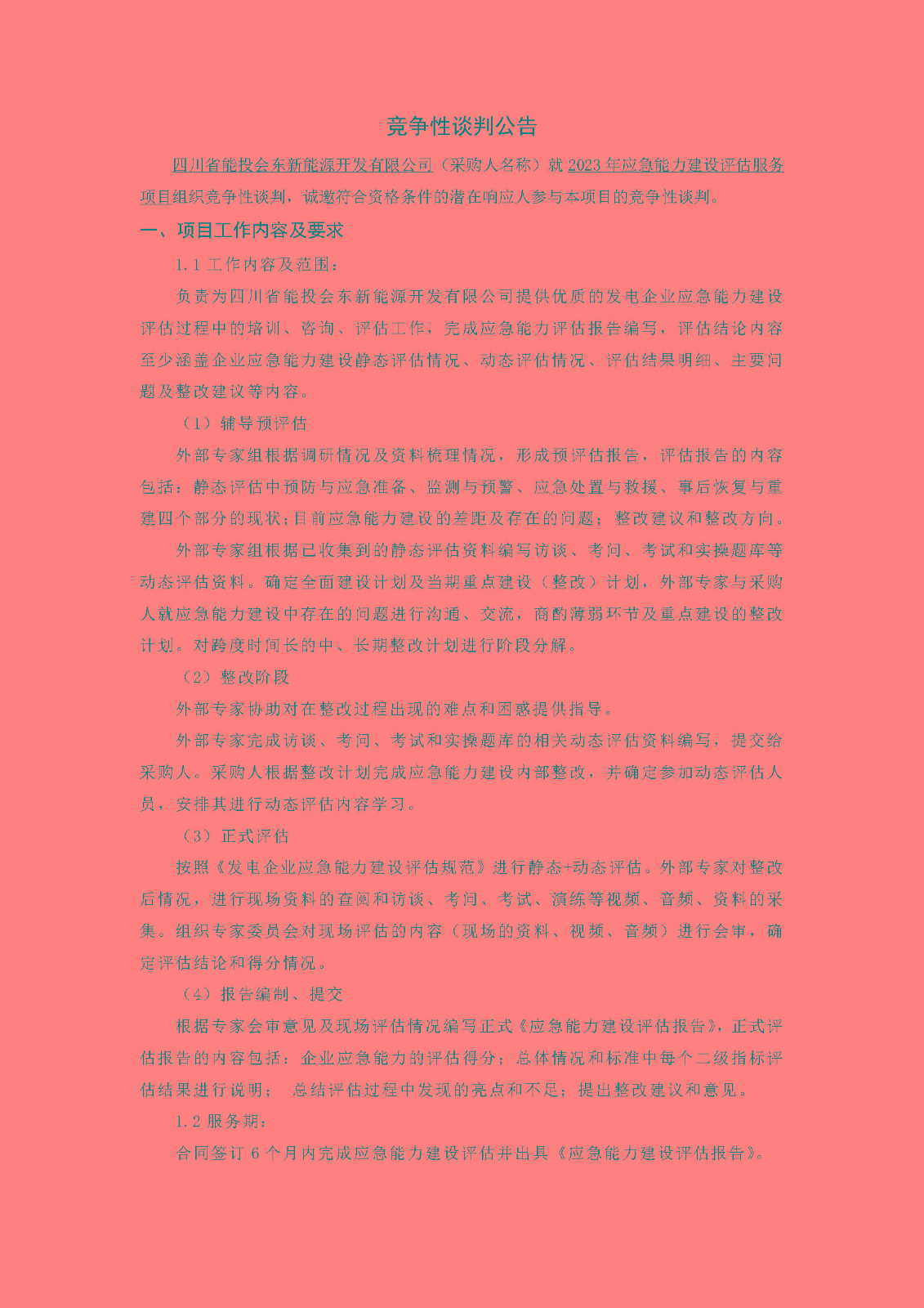 四川省能投会东新能源开发有限公司(采购人名称)就2023年应急能力建设评估服务项目组织竞争性谈判,诚邀符合资格条件的潜在响应人参与本项目的竞争性谈判。