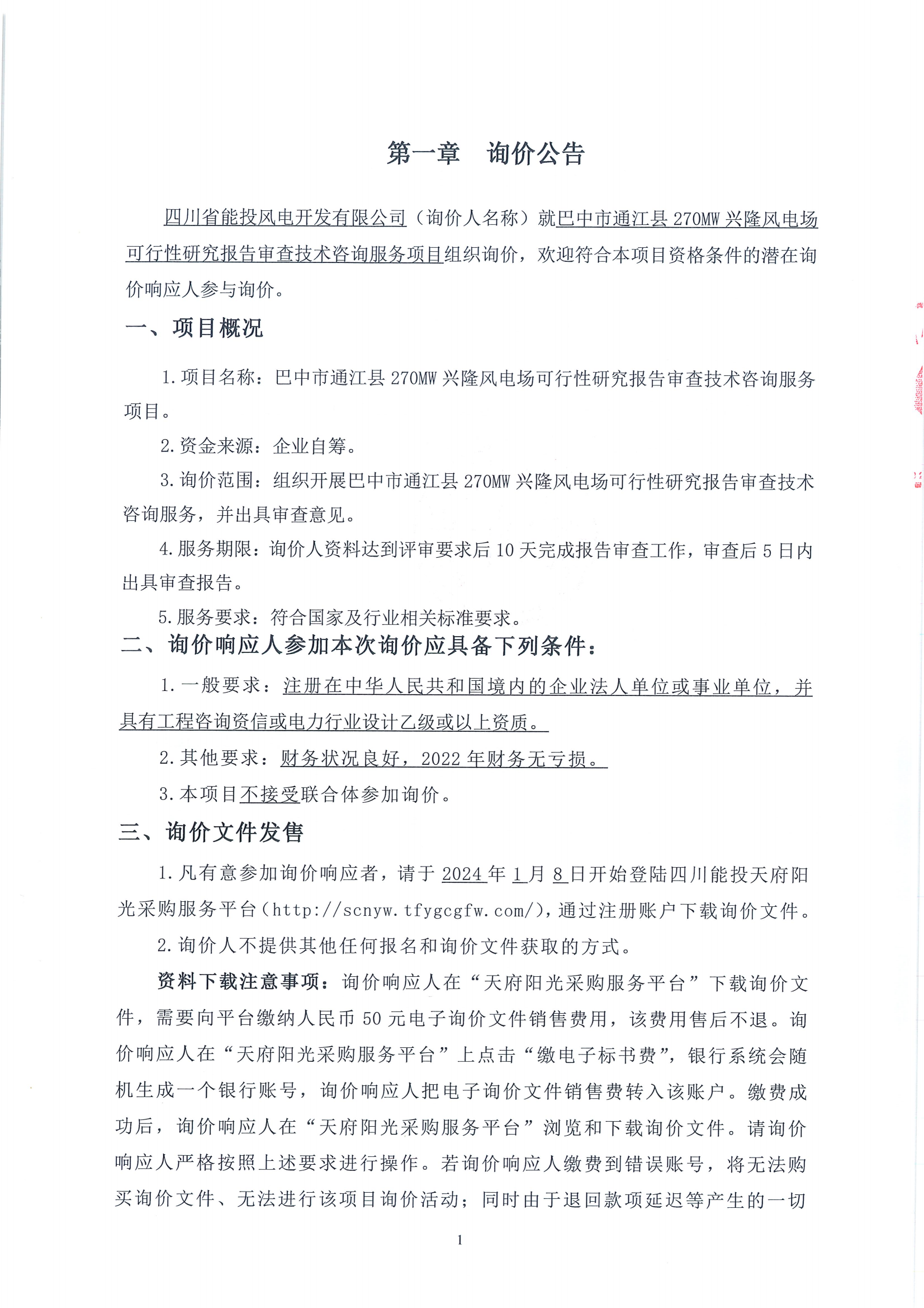 1.项目名称:巴中市通江县270MW兴隆风电场可行性研究报告审查技术咨询服务项目。