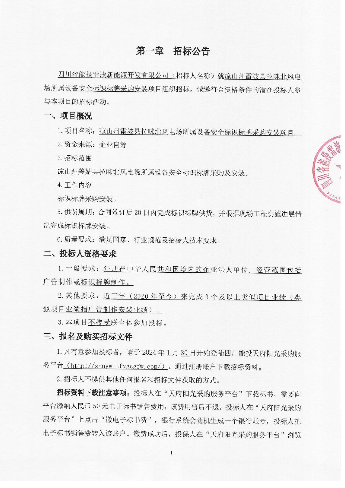 四川省能投雷波新能源开发有限公司(招标人名称)就凉山州雷波县拉咪北风电场所属设备安全标识标牌采购安装项目组织招标,诚邀符合资格条件的潜在投标人参与本项目的招标活动。
