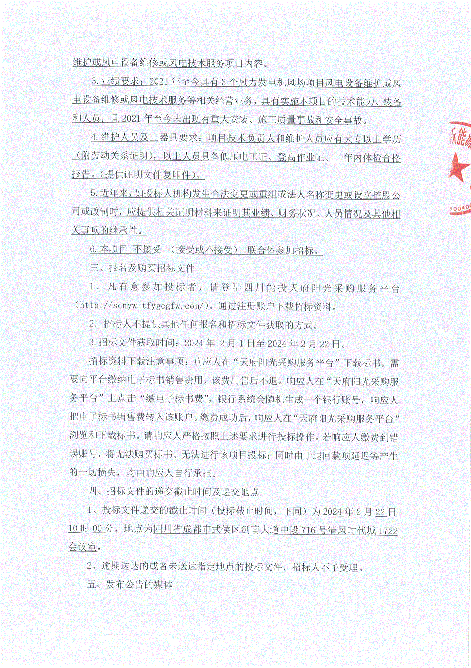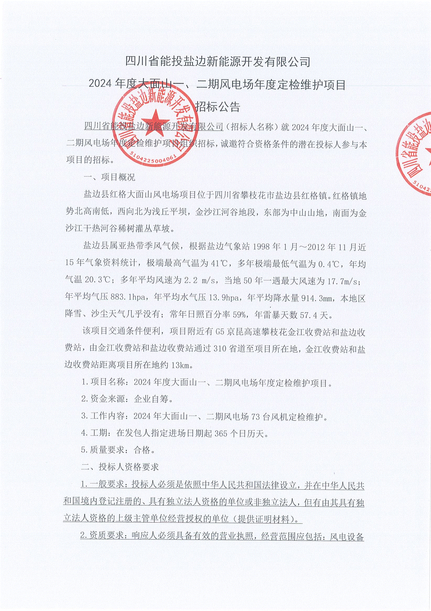 四川省能投盐边新能源开发有限公司(招标人名称)就2024年度大面山一、二期风电场年度定检维护项目组织招标,诚邀符合资格条件的潜在投标人参与本项目的招标。
