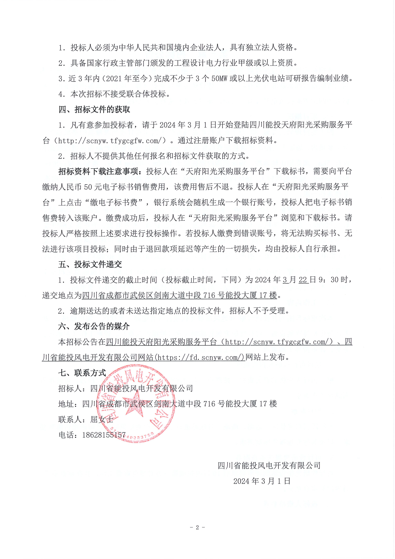 1.凡有意参加投标者,请于2024年3月1日开始登陆四川能投天府阳光采购服务平台(http://scnyw.tfygcgfw.com/)。通过注册账户下载招标资料。