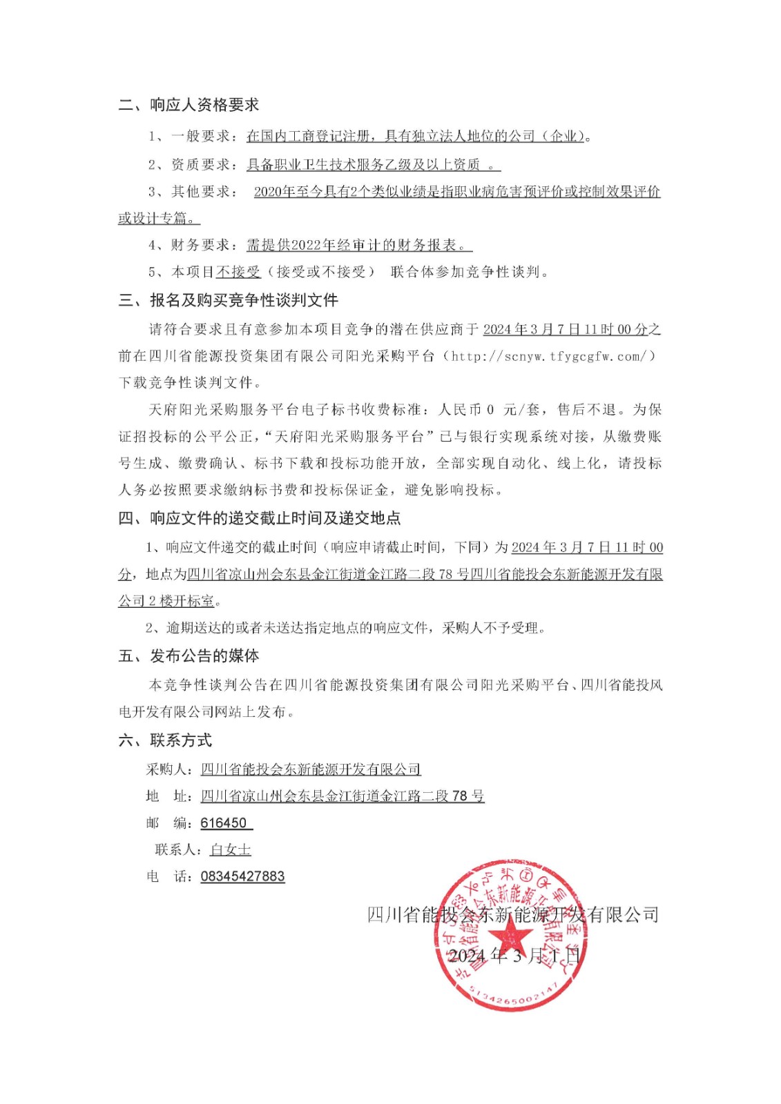 四川省能投会东新能源开发有限公司(采购人名称)就会东县小街二期风电场职业病危害预评价、设计专篇、控制效果评价报告编制项目组织竞争性谈判,诚邀符合资格条件的潜在响应人参与本项目的竞争性谈判。