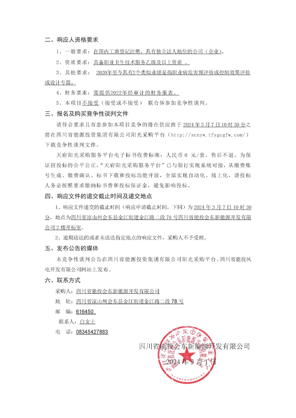 四川省能投会东新能源开发有限公司(采购人名称)就会东县淌塘三期风电场职业病危害预评价、设计专篇、控制效果评价报告编制项目组织竞争性谈判,诚邀符合资格条件的潜在响应人参与本项目的竞争性谈判。