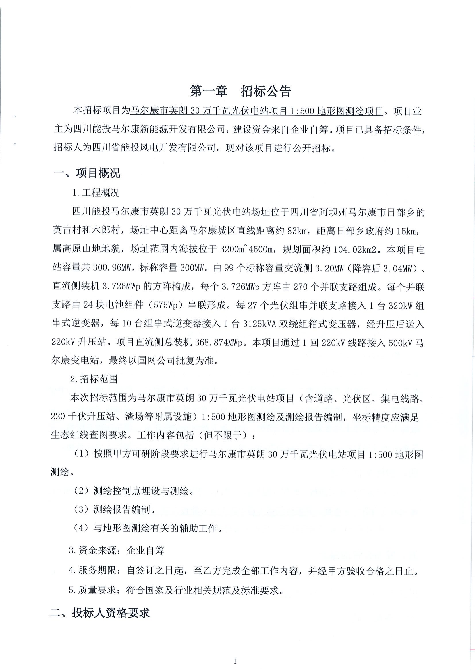 本次招标范围为马尔康市英朗30万千瓦光伏电站项目(含道路、光伏区、集电线路、220千伏升压站、渣场等附属设施)1:500地形图测绘及测绘报告编制,坐标精度应满足生态红线查图要求。工作内容包括(但不限于):