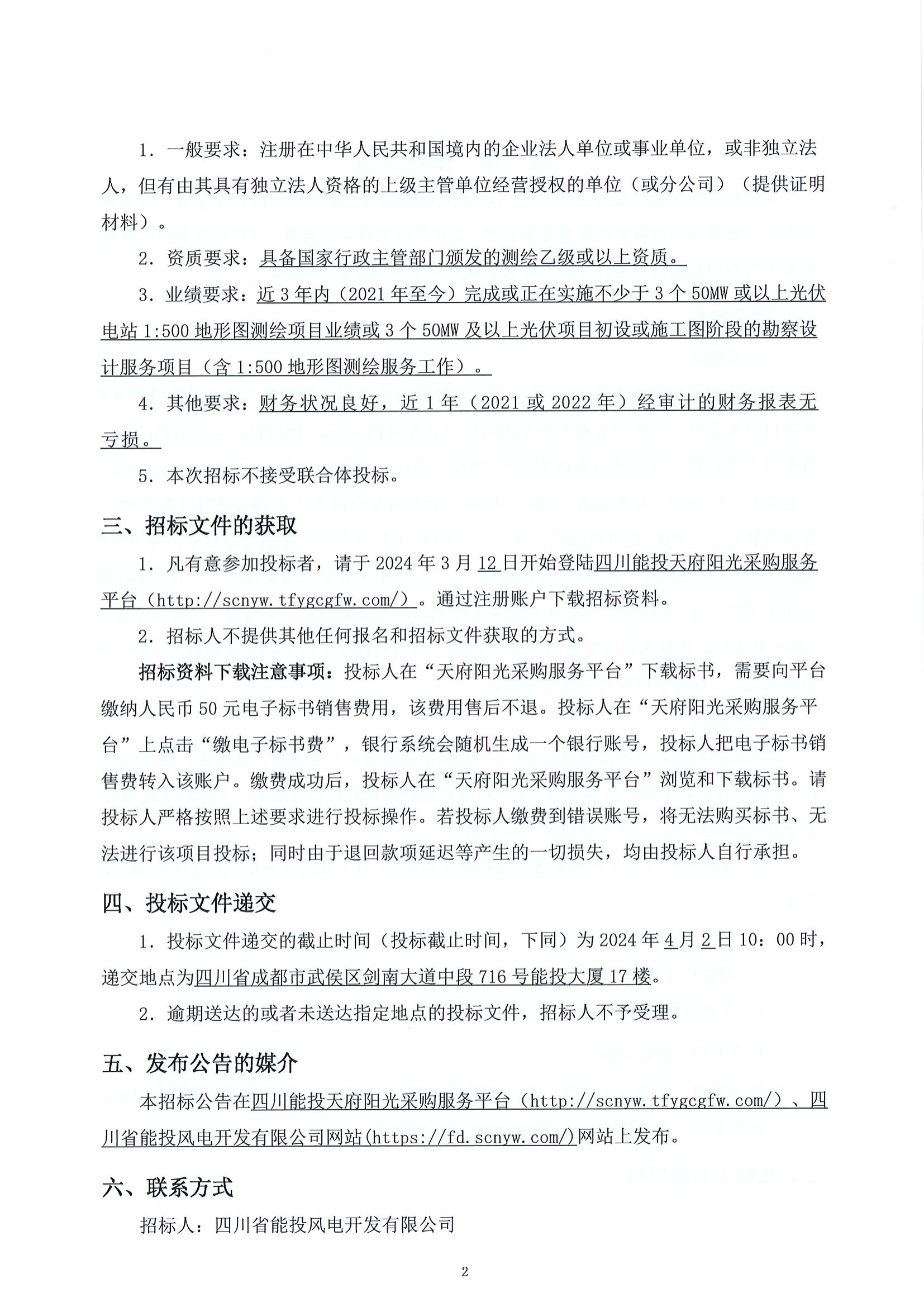 1.凡有意参加投标者,请于2024年3月12日开始登陆四川能投天府阳光采购服务平台(http://scnyw.tfygcgfw.com/)。通过注册账户下载招标资料。