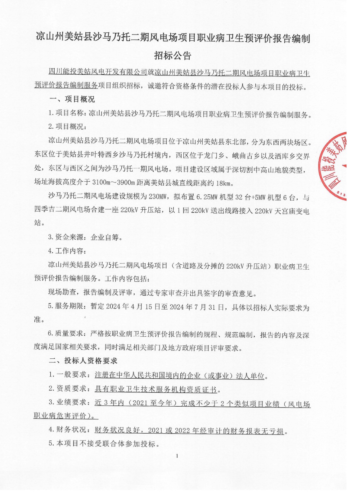 四川能投美姑风电开发有限公司就凉山州美姑县沙马乃托二期风电场项目职业病卫生预评价报告编制服务项目组织招标,诚邀符合资格条件的潜在投标人参与本项目的投标。