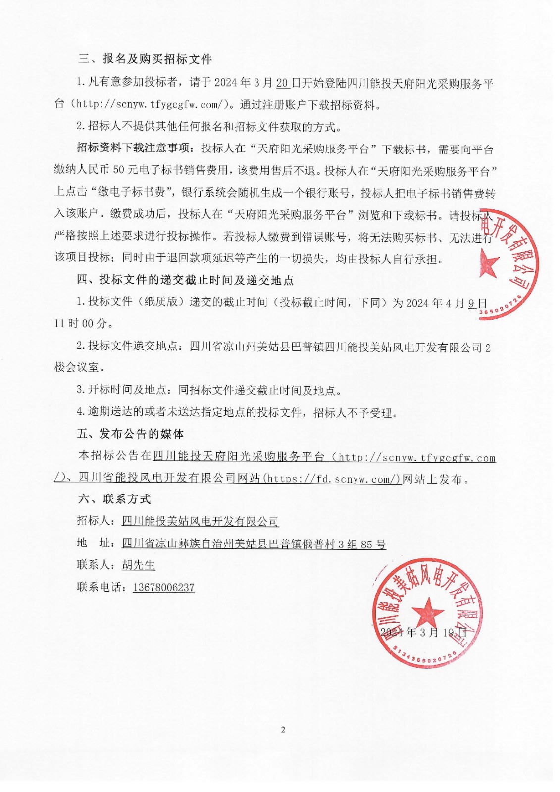 2.投标文件递交地点:四川省凉山州美姑县巴普镇四川能投美姑风电开发有限公司2楼会议室。