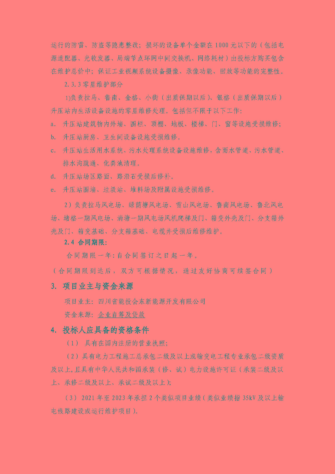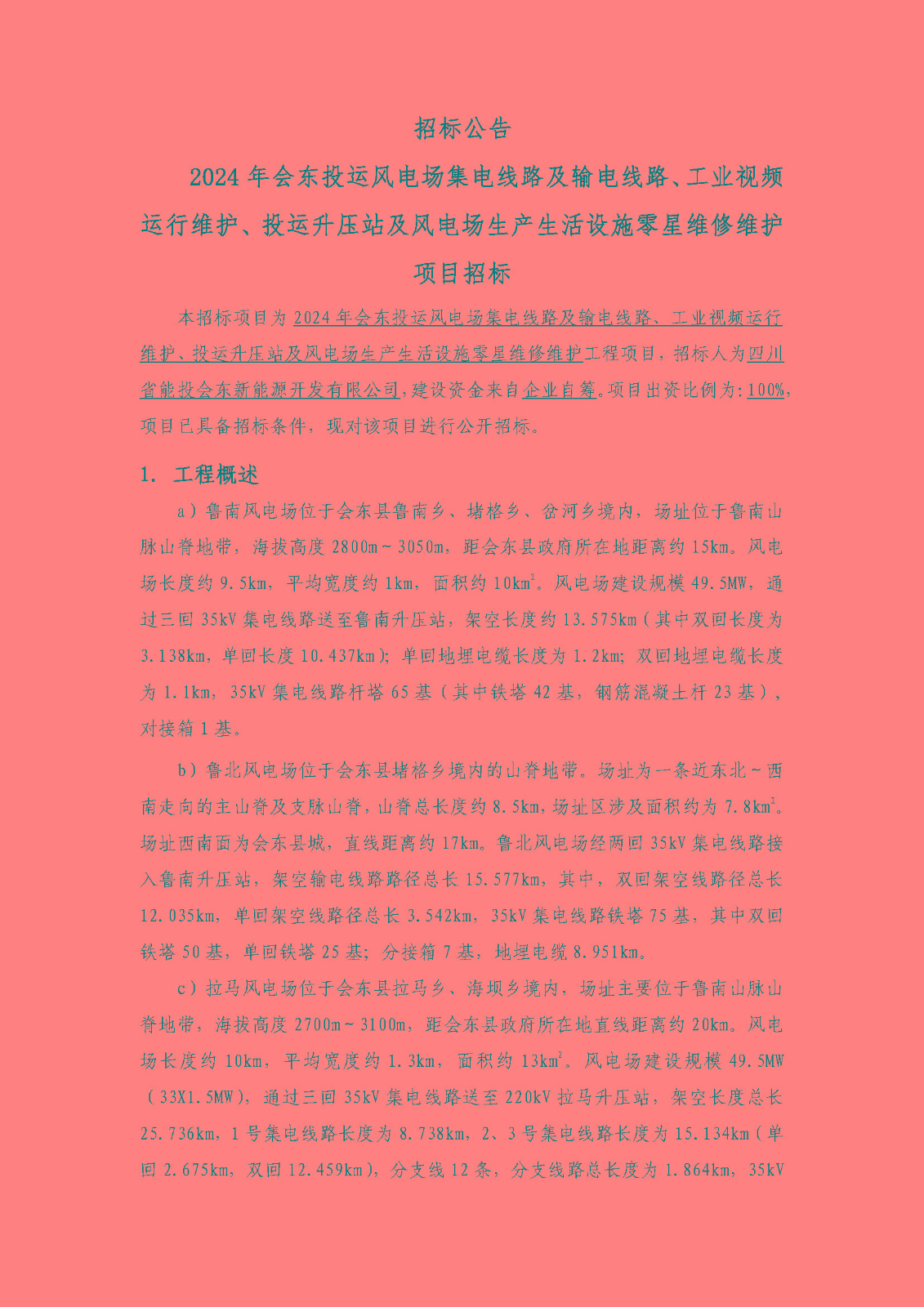 本招标项目为2024年会东投运风电场集电线路及输电线路、工业视频运行维护、投运升压站及风电场生产生活设施零星维修维护工程项目,招标人为四川省能投会东新能源开发有限公司,建设资金来自企业自筹。项目出资比例为:100%,项目已具备招标条件,现对该项目进行公开招标。