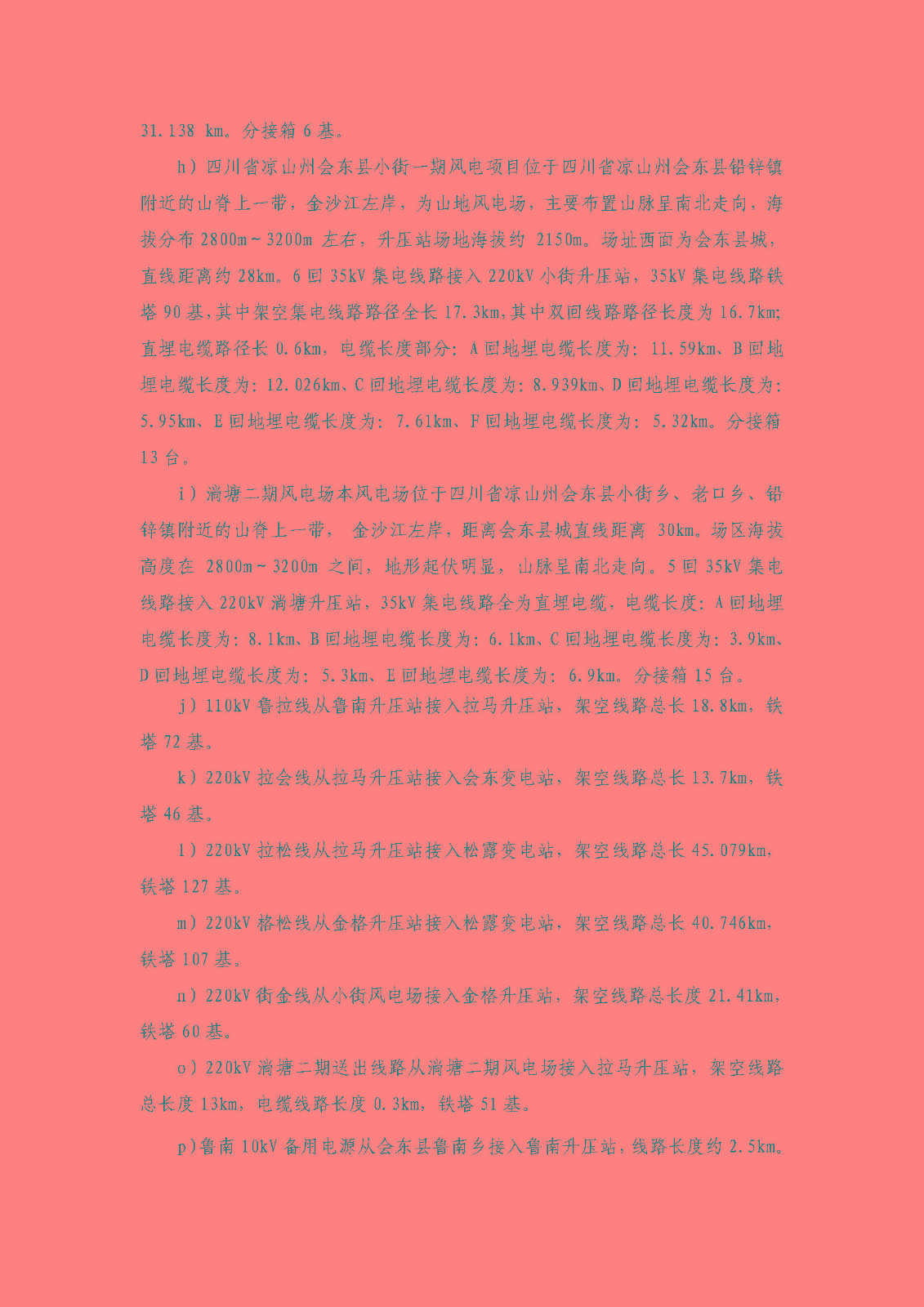 h)四川省凉山州会东县小街一期风电项目位于四川省凉山州会东县铅锌镇附近的山脊上一带,金沙江左岸,为山地风电场,主要布置山脉呈南北走向,海拔分布2800m~3200m 左右,升压站场地海拔约 2150m。场址西面为会东县城,直线距离约28km。6回35kV集电线路接入220kV小街升压站,35kV集电线路铁塔90基,其中架空集电线路路径全长17.3km,其中双回线路路径长度为16.7km;直埋电缆路径长0.6km,电缆长度部分:A回地埋电缆长度为:11.59km、B回地埋电缆长度为:12.026km、C回地埋电缆长度为:8.939km、D回地埋电缆长度为:5.95km、E回地埋电缆长度为:7.61km、F回地埋电缆长度为:5.32km。分接箱13台。