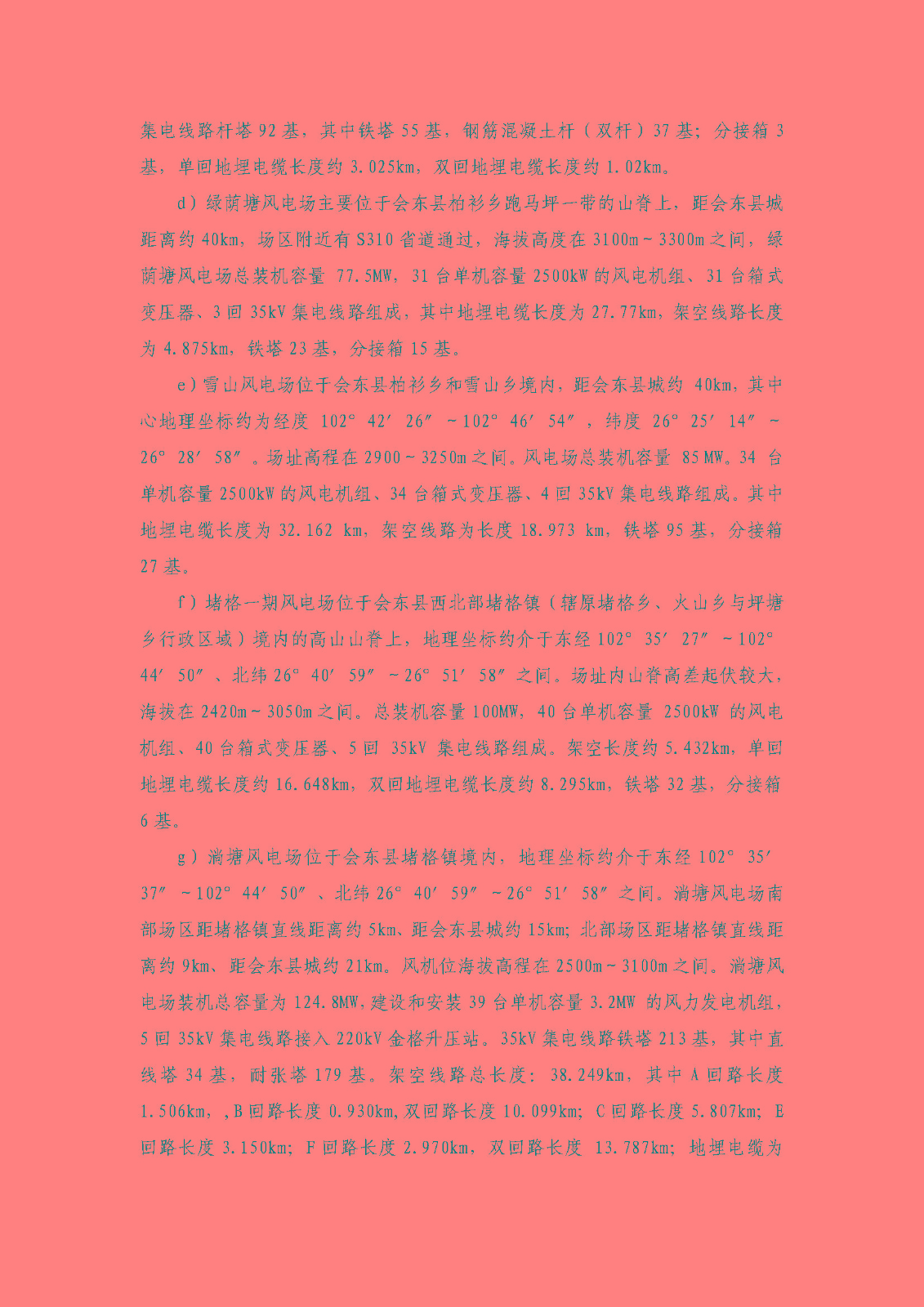 f)堵格一期风电场位于会东县西北部堵格镇(辖原堵格乡、火山乡与坪塘乡行政区域)境内的高山山脊上,地理坐标约介于东经102°35′27″~102°44′50″、北纬26°40′59″~26°51′58″之间。场址内山脊高差起伏较大,海拔在2420m~3050m之间。总装机容量100MW,40台单机容量 2500kW 的风电机组、40台箱式变压器、5回 35kV 集电线路组成。架空长度约5.432km,单回地埋电缆长度约16.648km,双回地埋电缆长度约8.295km,铁塔32基,分接箱6基。