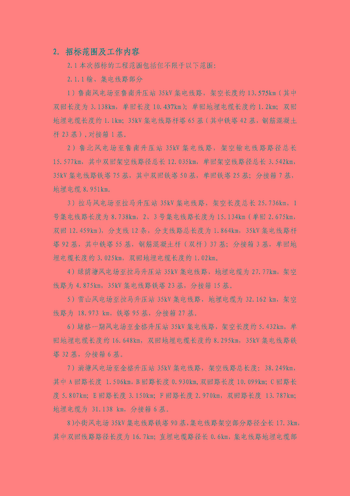 1)鲁南风电场至鲁南升压站35kV集电线路,架空长度约13.575km(其中双回长度为3.138km,单回长度10.437km);单回地埋电缆长度约1.2km;双回地埋电缆长度约1.1km;35kV集电线路杆塔65基(其中铁塔42基,钢筋混凝土杆23基),对接箱1基。