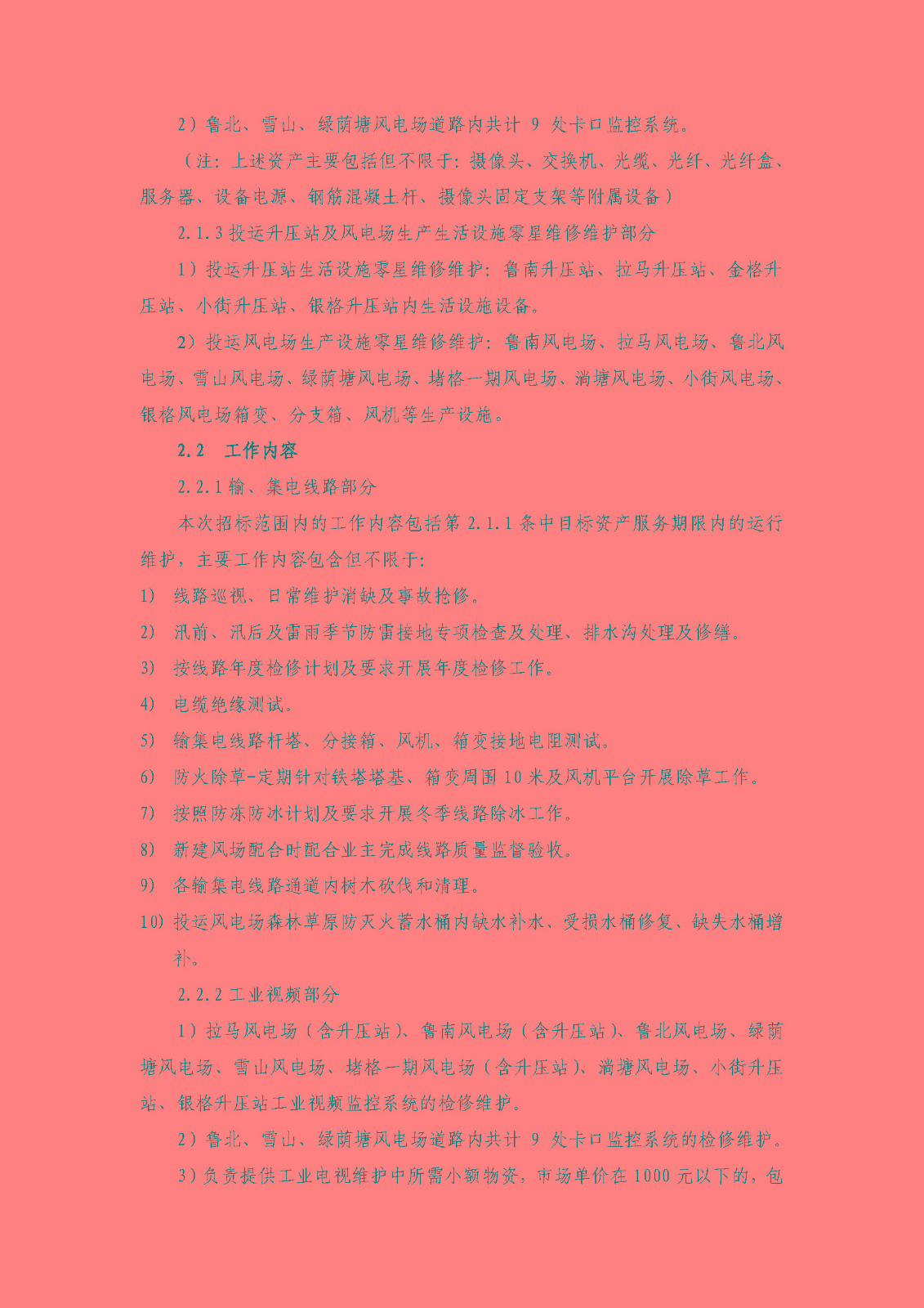 1)拉马风电场(含升压站)、鲁南风电场(含升压站)、鲁北风电场、绿荫塘风电场、雪山风电场、堵格一期风电场(含升压站)、淌塘风电场、小街升压站、银格升压站工业视频监控系统的检修维护。
