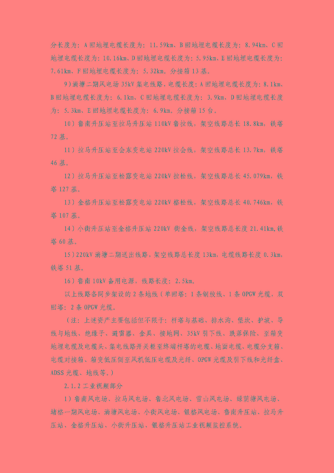 (注:上述资产主要包括但不限于:杆塔与基础、排水沟、堡坎、护坡、导线与地线、绝缘子、避雷器、金具、接地网、35kV引下线、跌落保险、至箱变地埋电缆及电缆头、集电线路开关柜至终端杆塔的电缆、地面电缆、电缆分支箱、电缆对接箱、箱变低压侧至风机低压电缆及光纤、OPGW光缆及引下线和光纤盒、ADSS光缆、地线等。)
