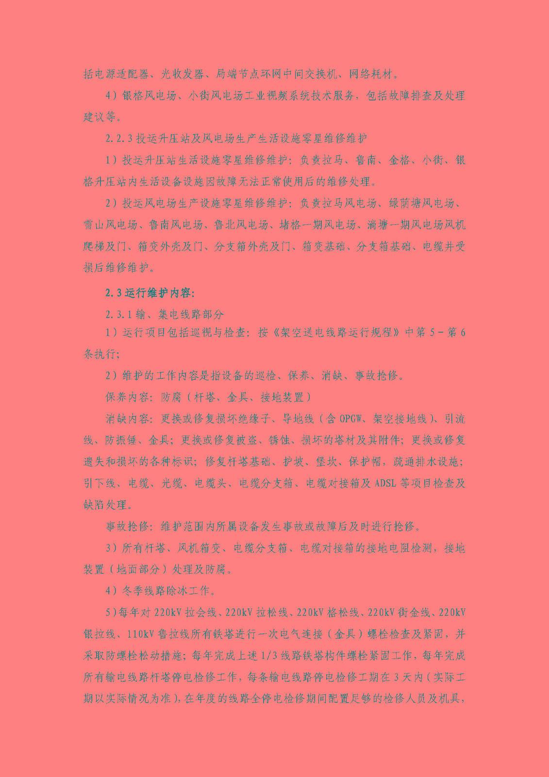 2)投运风电场生产设施零星维修维护:鲁南风电场、拉马风电场、鲁北风电场、雪山风电场、绿荫塘风电场、堵格一期风电场、淌塘风电场、小街风电场、银格风电场箱变、分支箱、风机等生产设施。