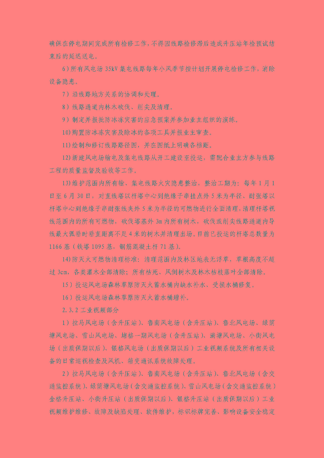 1)拉马风电场(含升压站)、鲁南风电场(含升压站)、鲁北风电场、绿荫塘风电场、雪山风电场、堵格一期风电场(含升压站)、淌塘风电场、小街风电场(出质保期以后)、银格风电场(出质保期以后)工业视频系统及所有相关设备的日常巡视检查及风机、箱变通讯系统故障处理。
