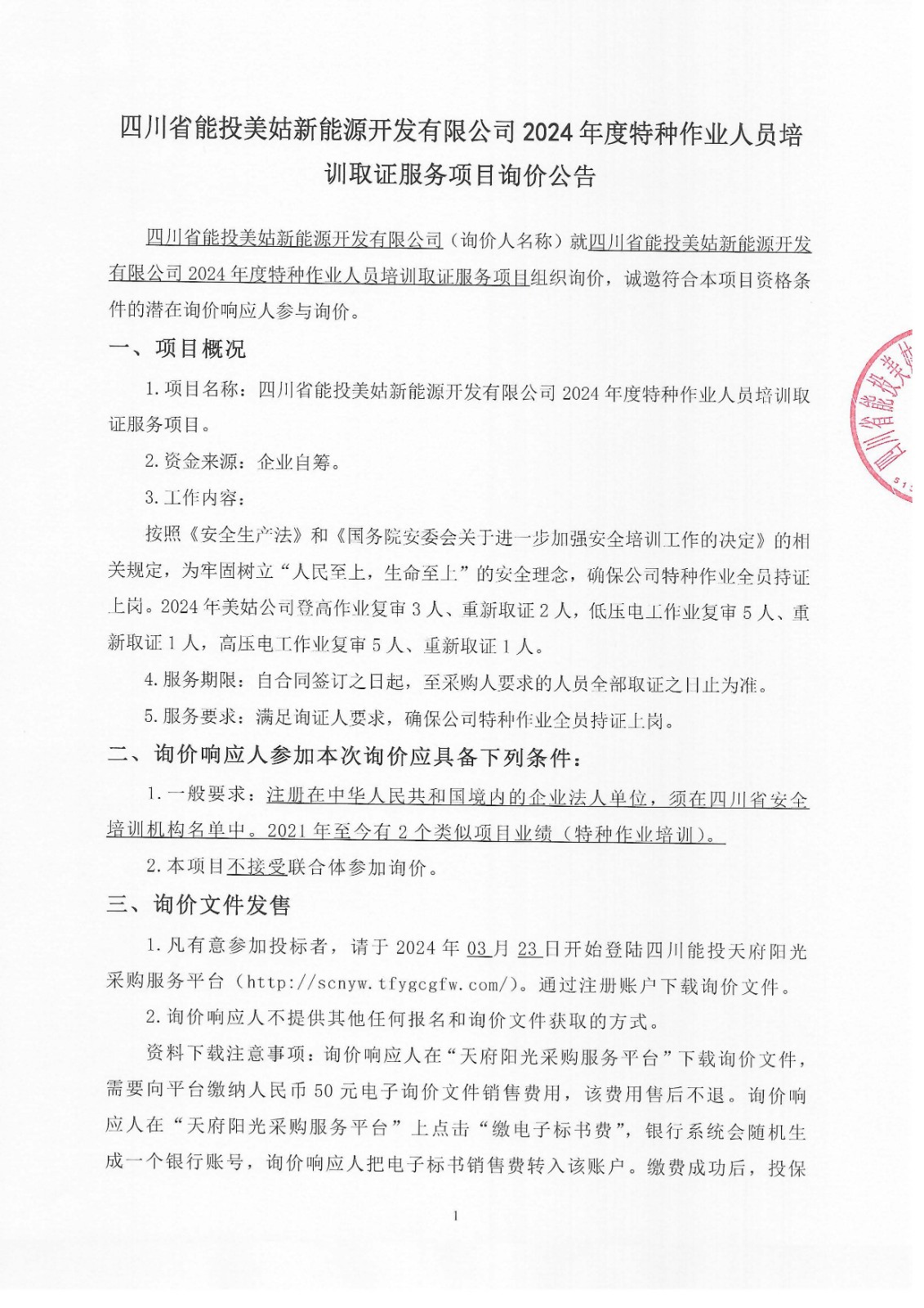 四川省能投美姑新能源开发有限公司(询价人名称)就四川省能投美姑新能源开发有限公司2024年度特种作业人员培训取证服务项目组织询价,诚邀符合本项目资格条件的潜在询价响应人参与询价。