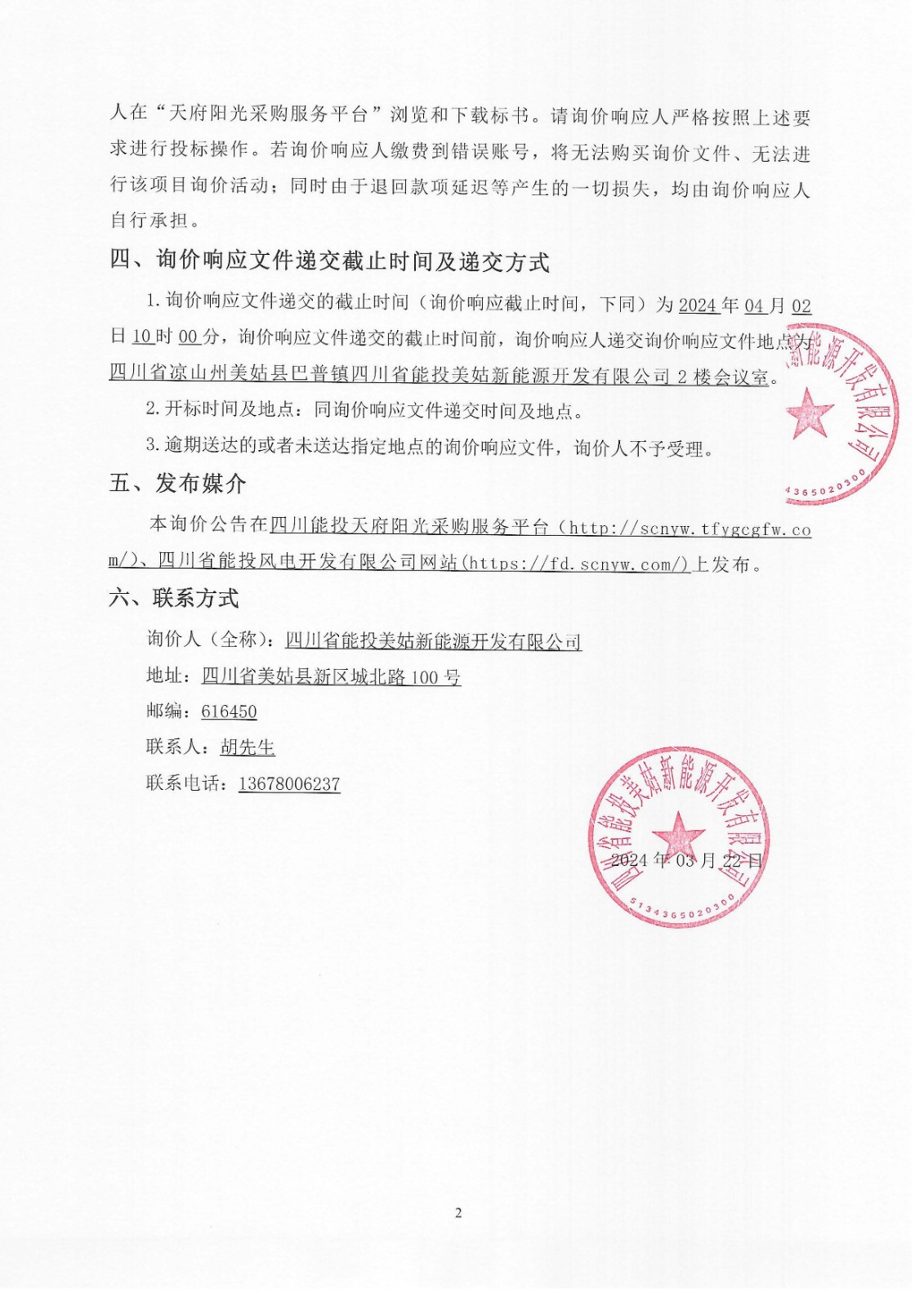 1.询价响应文件递交的截止时间(询价响应截止时间,下同)为2024年04月02日10时00分,询价响应文件递交的截止时间前,询价响应人递交询价响应文件地点为四川省凉山州美姑县巴普镇四川省能投美姑新能源开发有限公司2楼会议室。