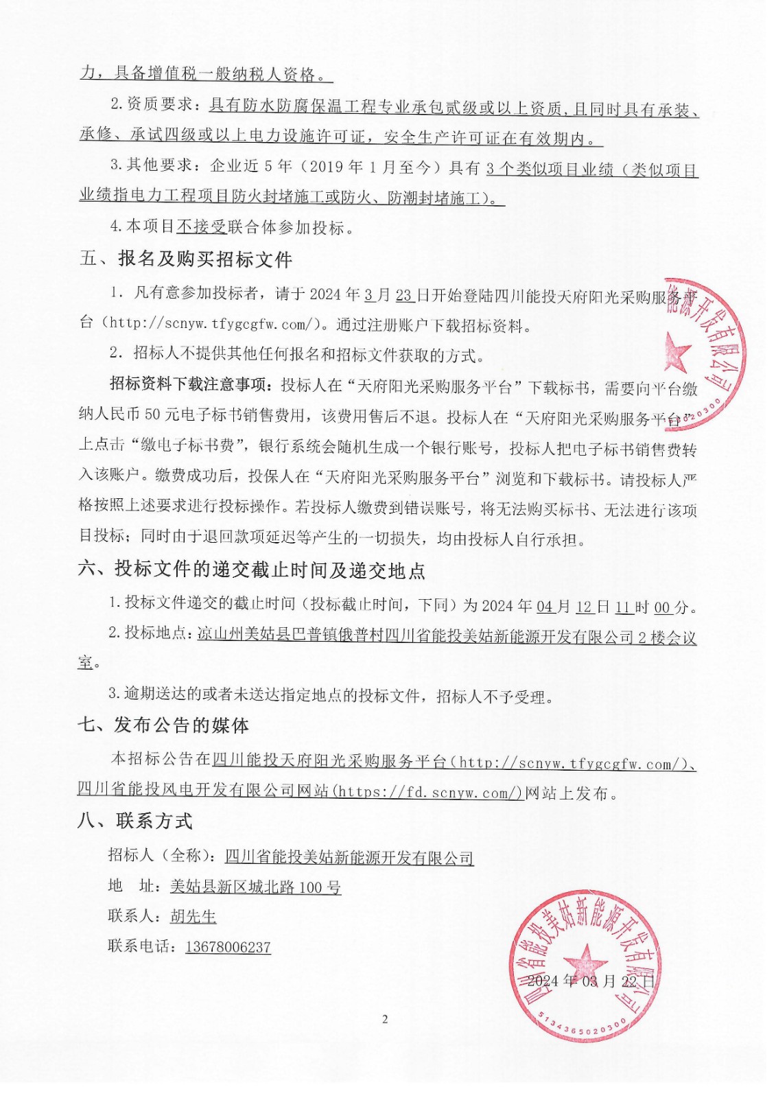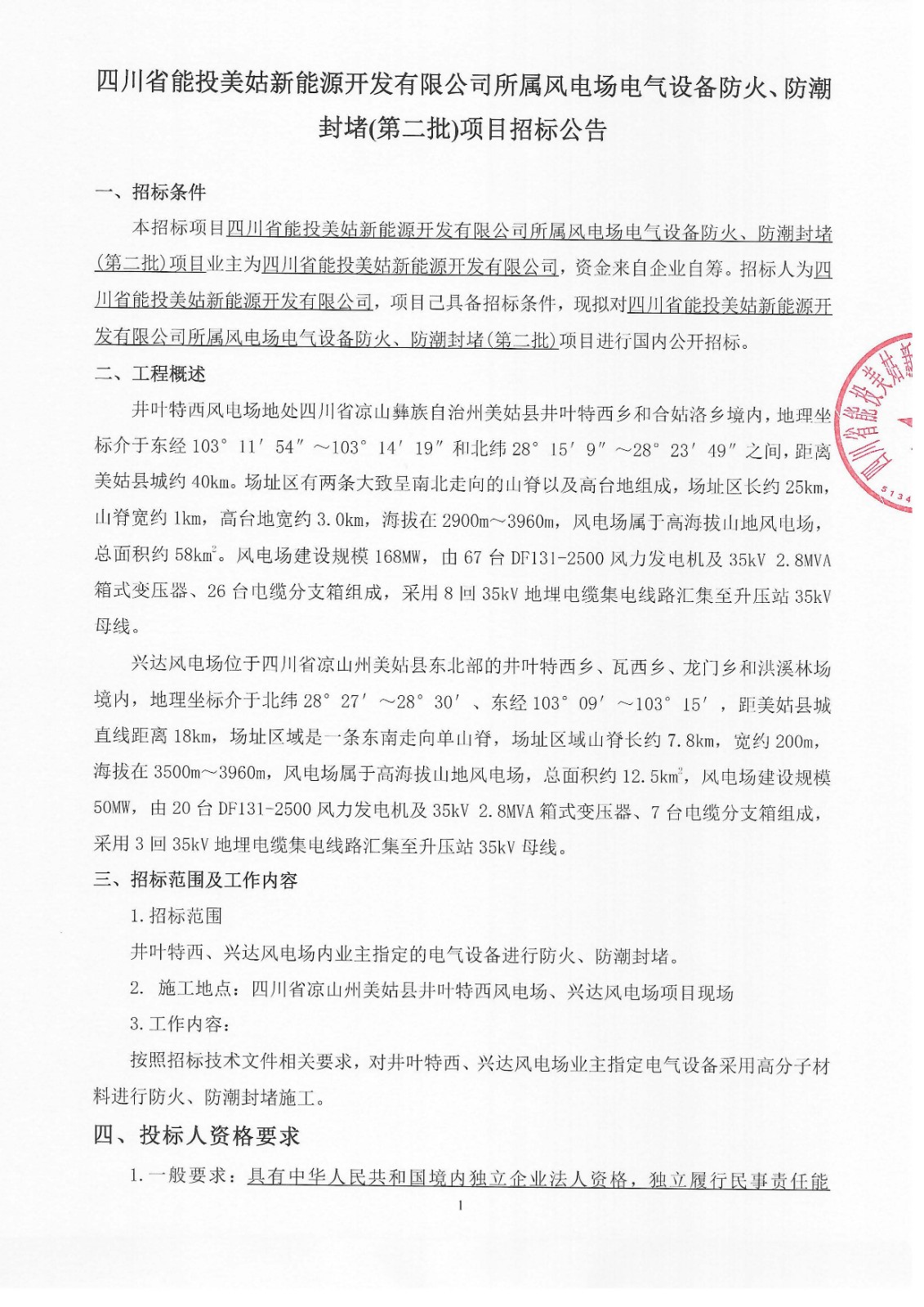 本招标项目四川省能投美姑新能源开发有限公司所属风电场电气设备防火、防潮封堵(第二批)项目业主为四川省能投美姑新能源开发有限公司,资金来自企业自筹。招标人为四川省能投美姑新能源开发有限公司,项目己具备招标条件,现拟对四川省能投美姑新能源开发有限公司所属风电场电气设备防火、防潮封堵(第二批)项目进行国内公开招标。