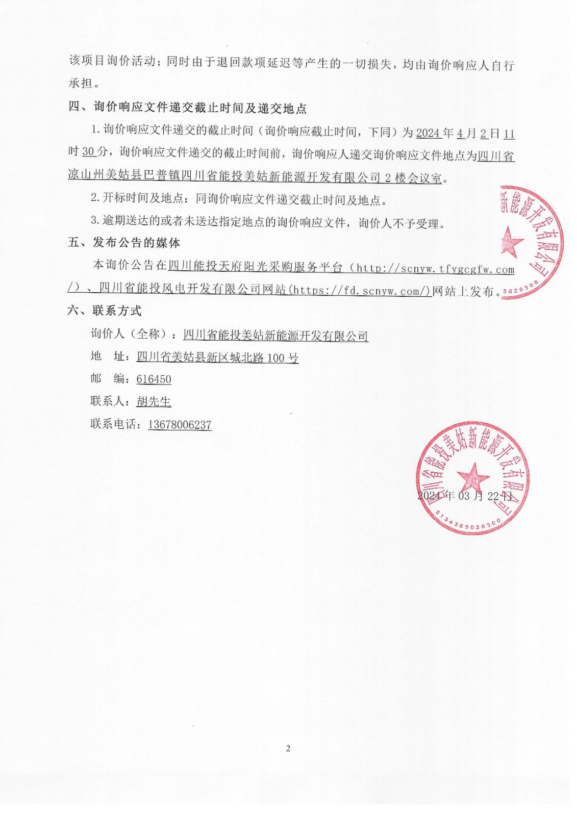 1.询价响应文件递交的截止时间(询价响应截止时间,下同)为2024年4月2日11时30分,询价响应文件递交的截止时间前,询价响应人递交询价响应文件地点为四川省凉山州美姑县巴普镇四川省能投美姑新能源开发有限公司2楼会议室。