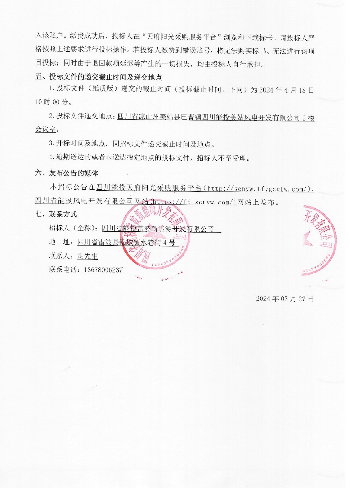 2.投标文件递交地点:四川省凉山州美姑县巴普镇四川能投美姑风电开发有限公司2楼会议室。