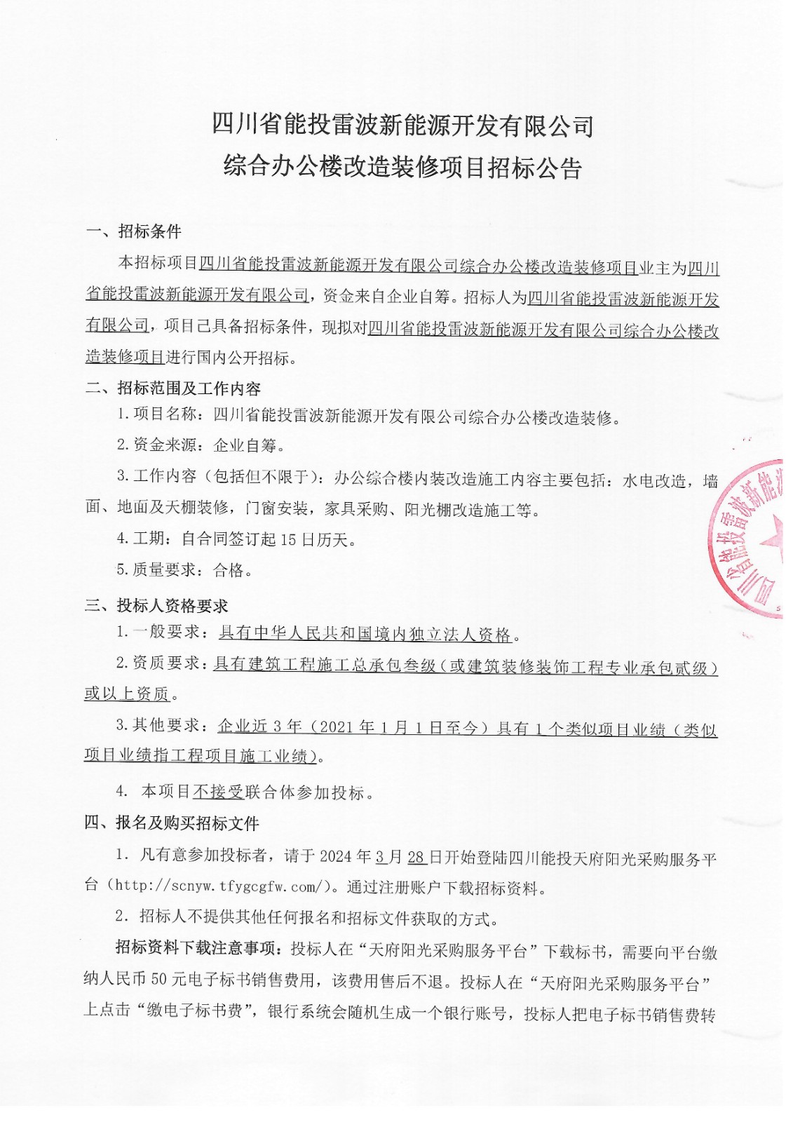 本招标项目四川省能投雷波新能源开发有限公司综合办公楼改造装修项目业主为四川省能投雷波新能源开发有限公司,资金来自企业自筹。招标人为四川省能投雷波新能源开发有限公司,项目己具备招标条件,现拟对四川省能投雷波新能源开发有限公司综合办公楼改造装修项目进行国内公开招标。