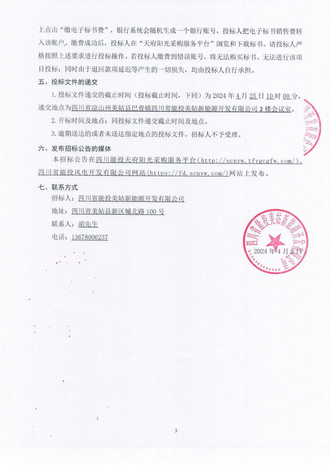 1.投标文件递交的截止时间(投标截止时间,下同)为2024年4月25日10时00分,递交地点为四川省凉山州美姑县巴普镇四川省能投美姑新能源开发有限公司2楼会议室。