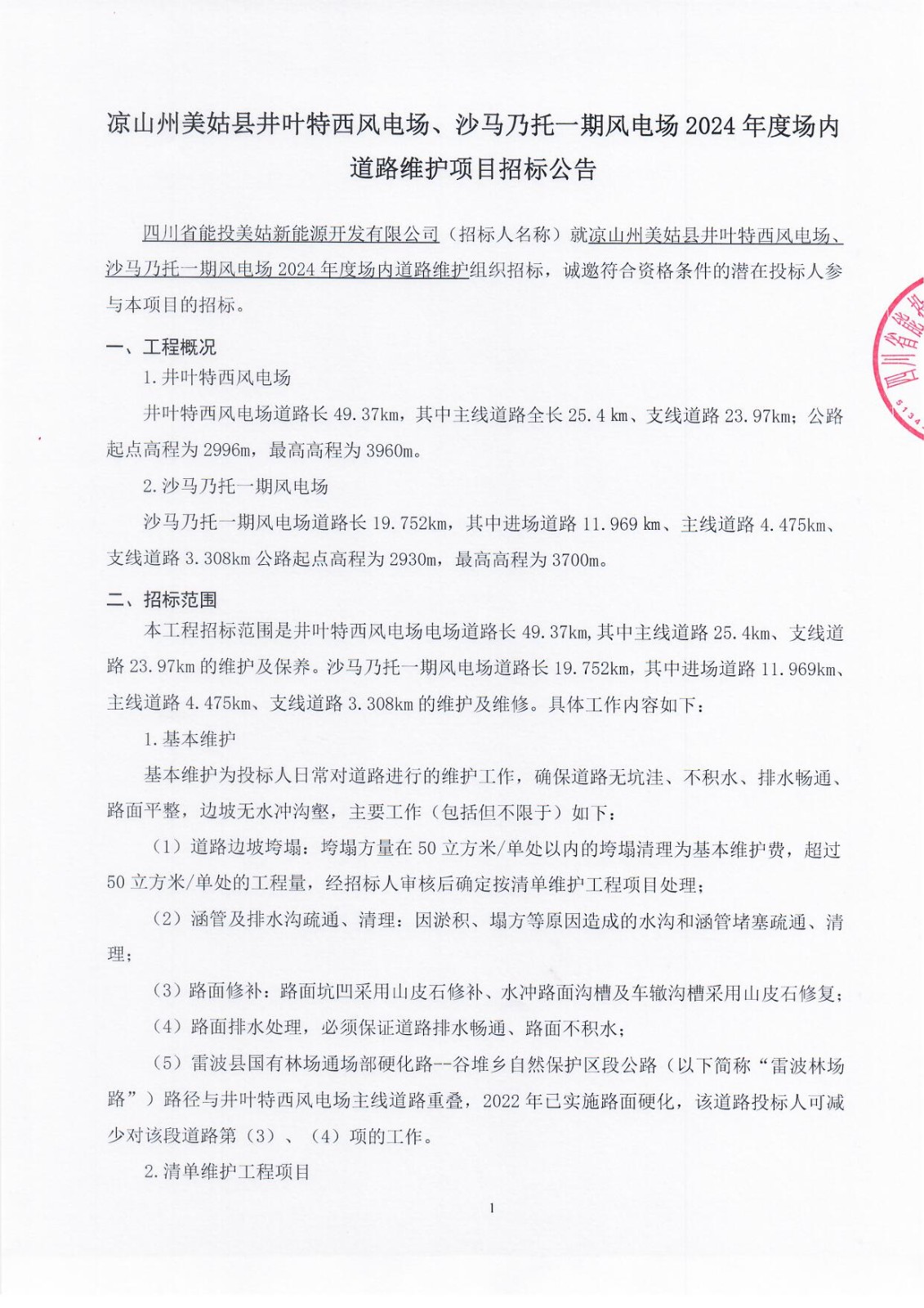 四川省能投美姑新能源开发有限公司(招标人名称)就凉山州美姑县井叶特西风电场、沙马乃托一期风电场2024年度场内道路维护组织招标,诚邀符合资格条件的潜在投标人参与本项目的招标。