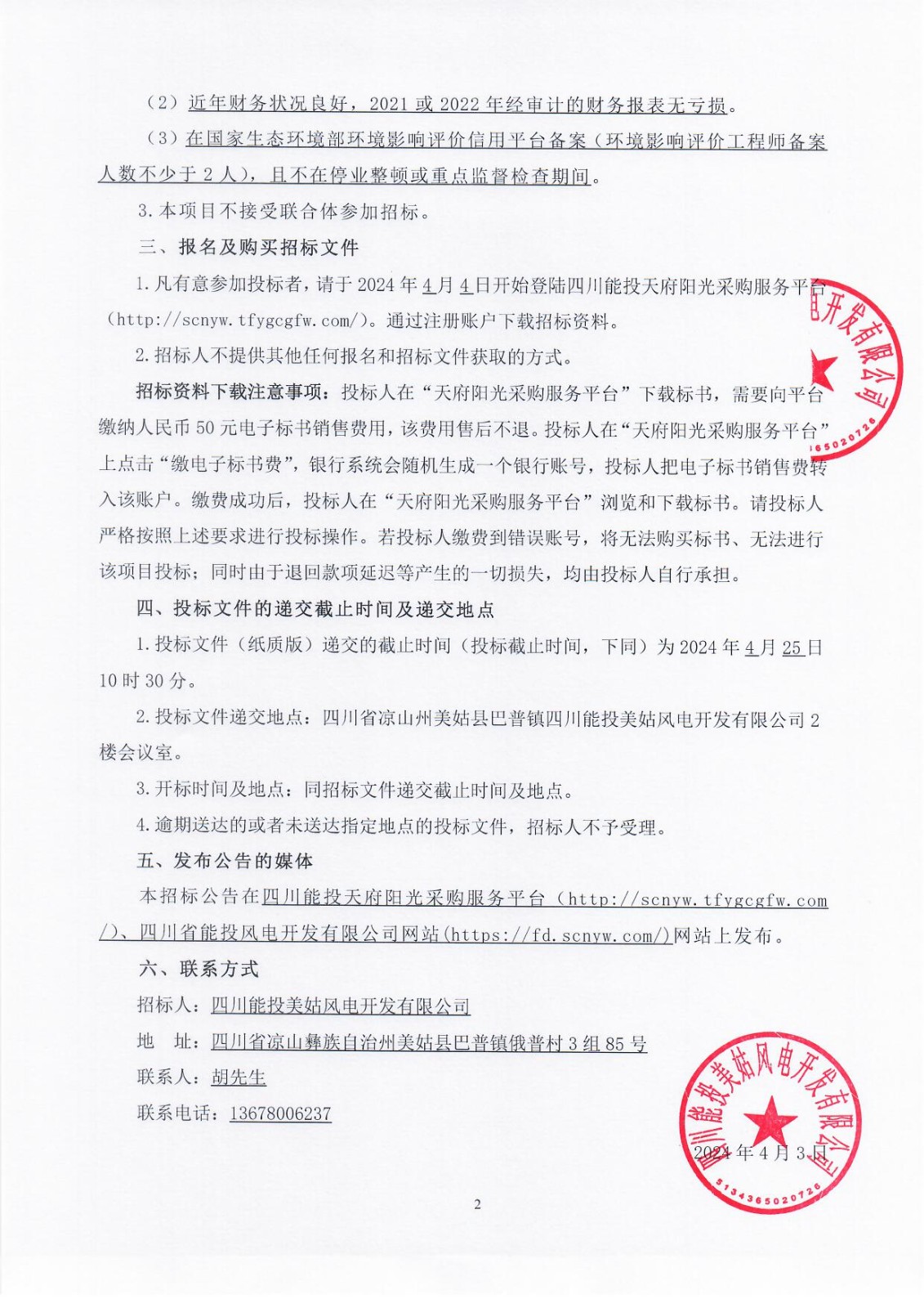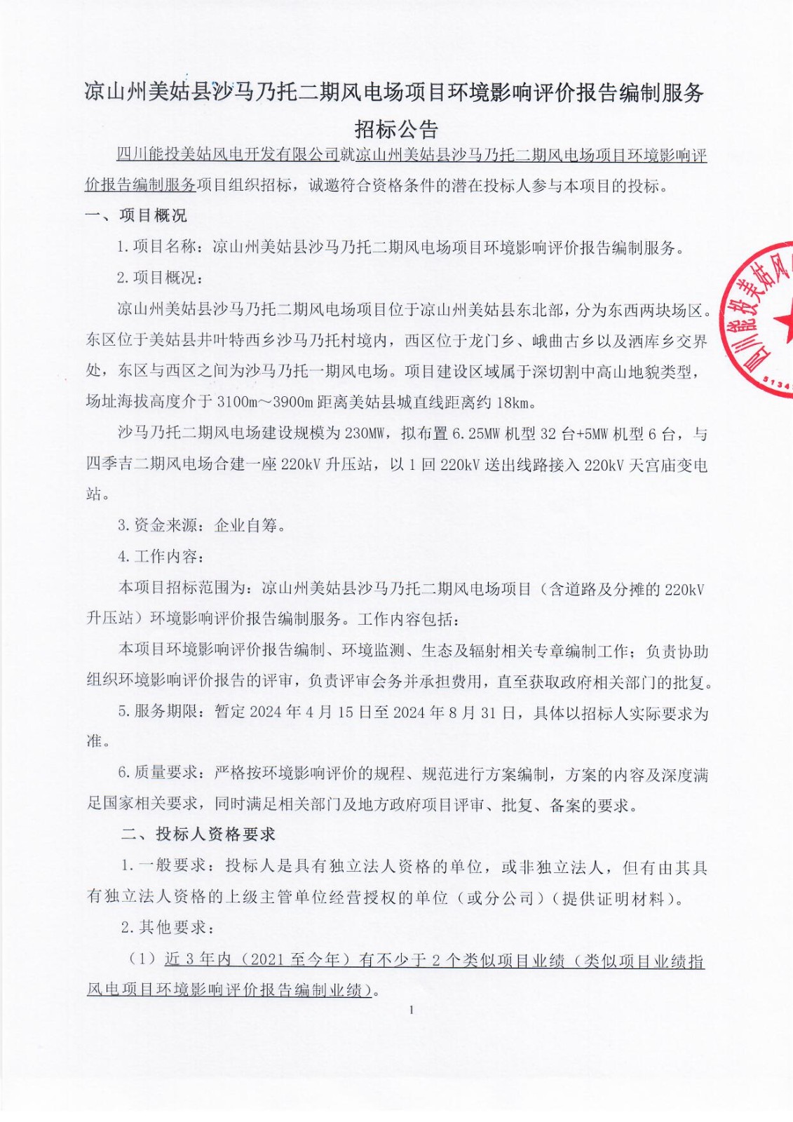 四川能投美姑风电开发有限公司就凉山州美姑县沙马乃托二期风电场项目环境影响评价报告编制服务项目组织招标,诚邀符合资格条件的潜在投标人参与本项目的投标。