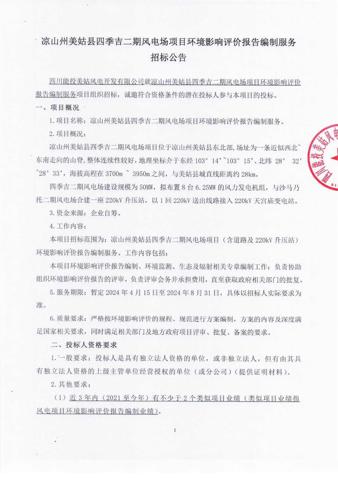 四川能投美姑风电开发有限公司就凉山州美姑县四季吉二期风电场项目环境影响评价报告编制服务项目组织招标,诚邀符合资格条件的潜在投标人参与本项目的投标。