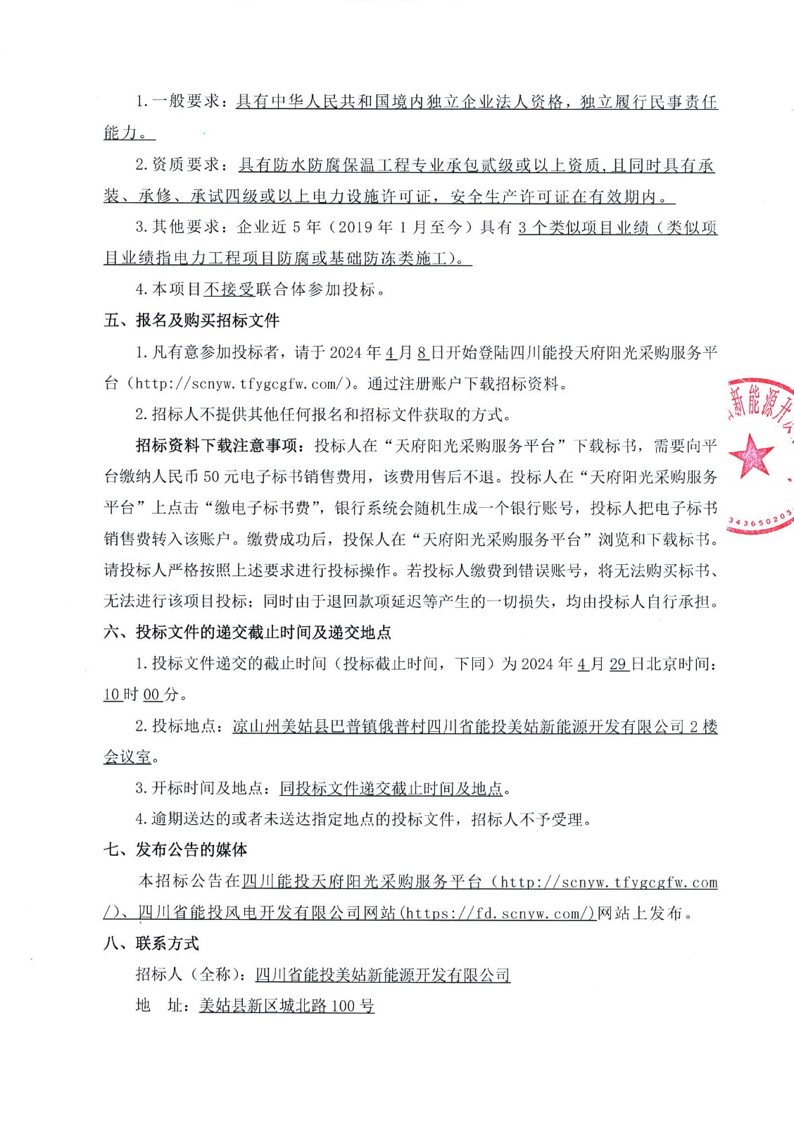 2.投标地点:凉山州美姑县巴普镇俄普村四川省能投美姑新能源开发有限公司2楼会议室。