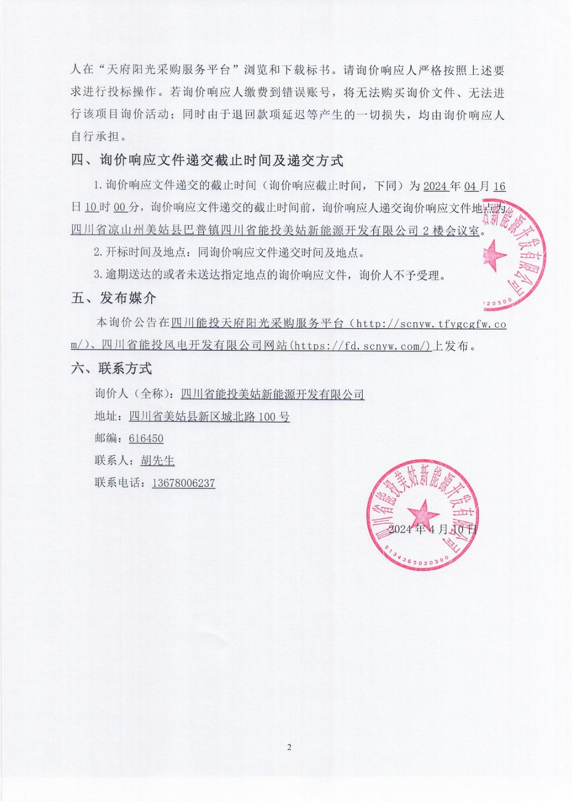 1.询价响应文件递交的截止时间(询价响应截止时间,下同)为2024年04月16日10时00分,询价响应文件递交的截止时间前,询价响应人递交询价响应文件地点为四川省凉山州美姑县巴普镇四川省能投美姑新能源开发有限公司2楼会议室。