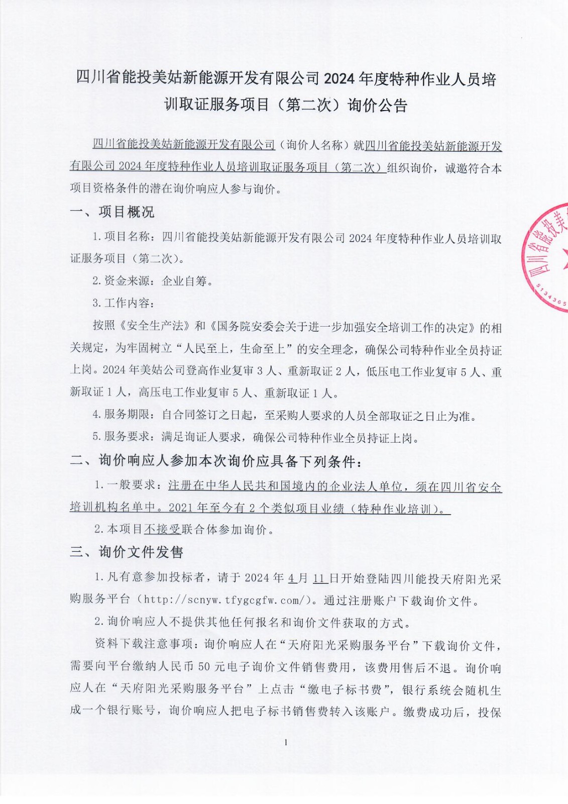 四川省能投美姑新能源开发有限公司(询价人名称)就四川省能投美姑新能源开发有限公司2024年度特种作业人员培训取证服务项目(第二次)组织询价,诚邀符合本项目资格条件的潜在询价响应人参与询价。