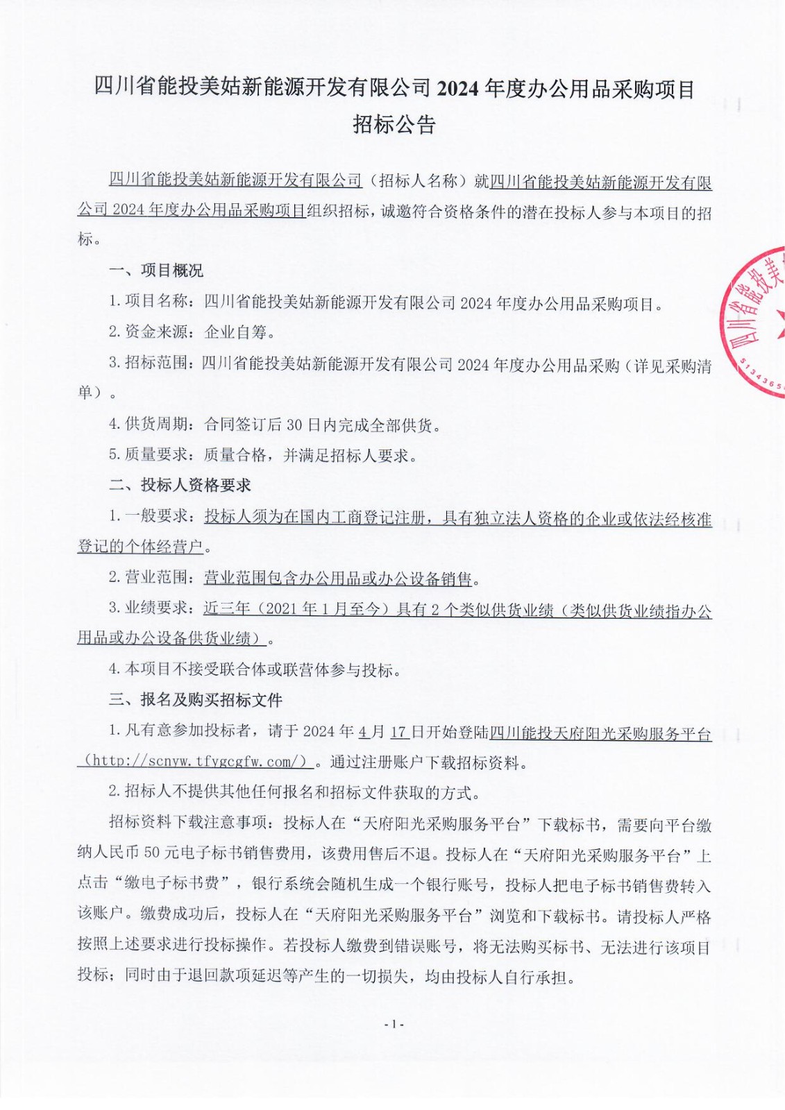 四川省能投美姑新能源开发有限公司(招标人名称)就四川省能投美姑新能源开发有限公司2024年度办公用品采购项目组织招标,诚邀符合资格条件的潜在投标人参与本项目的招标。