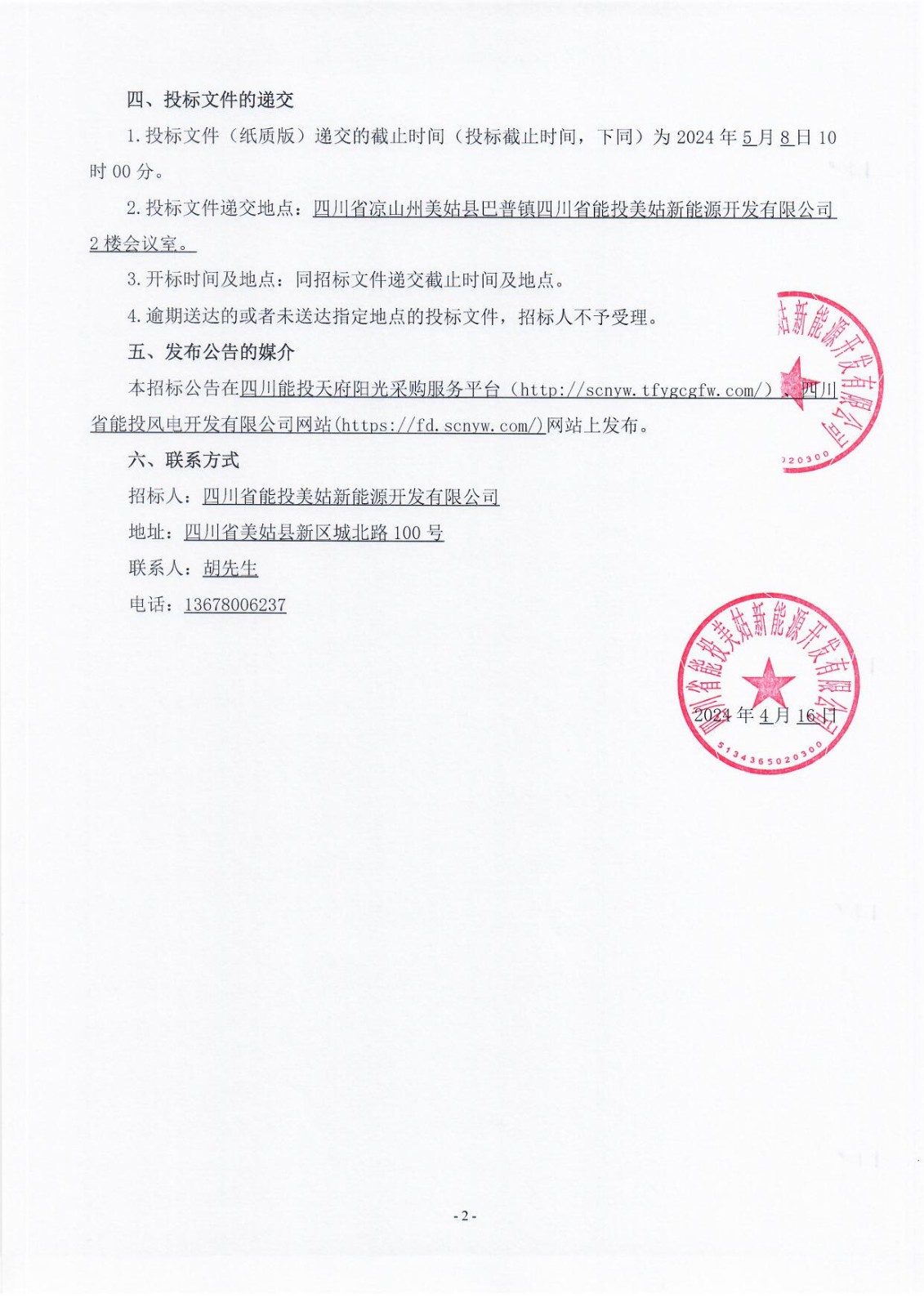 2.投标文件递交地点:四川省凉山州美姑县巴普镇四川省能投美姑新能源开发有限公司2楼会议室。