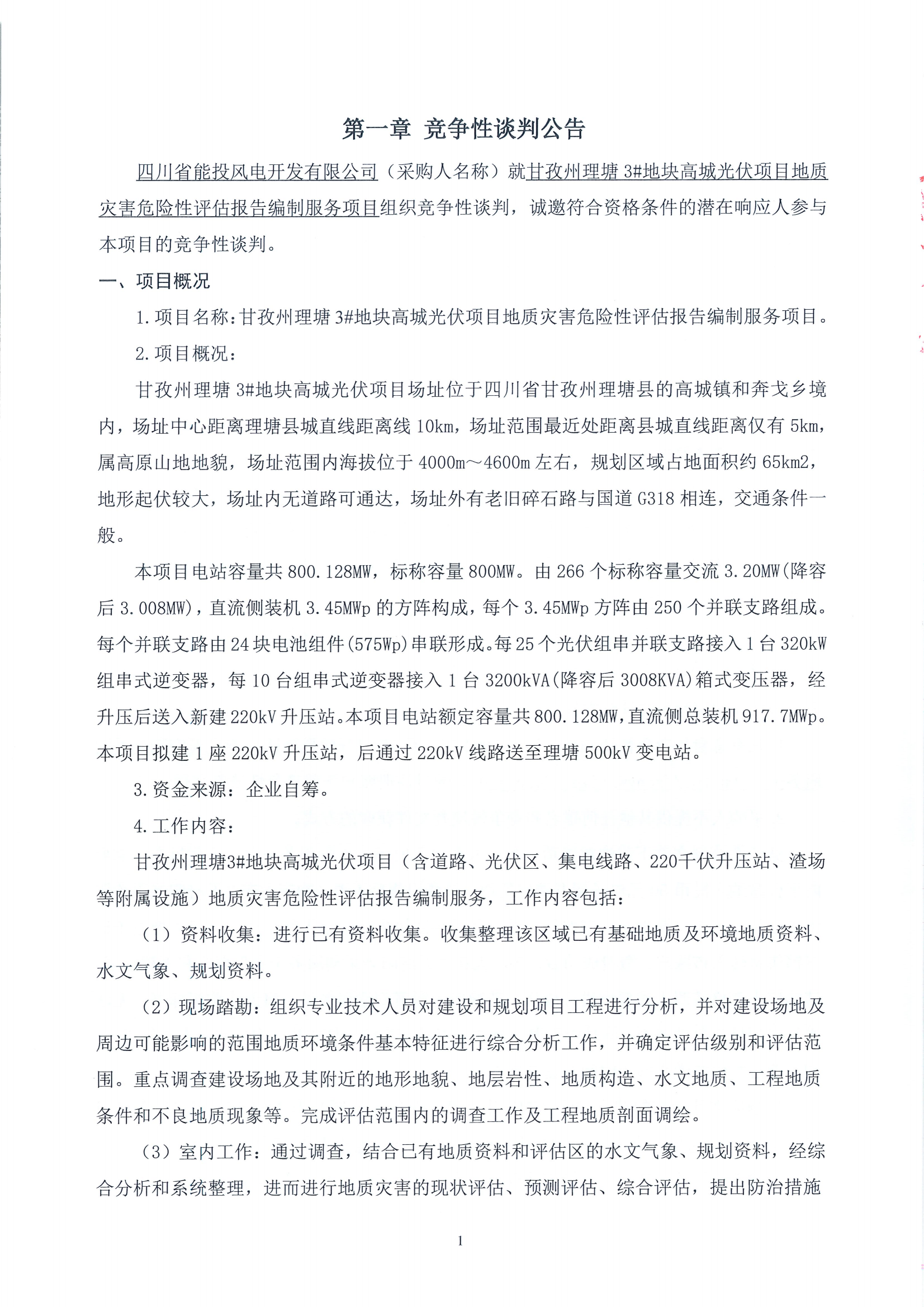 1.项目名称:甘孜州理塘3#地块高城光伏项目地质灾害危险性评估报告编制服务项目。