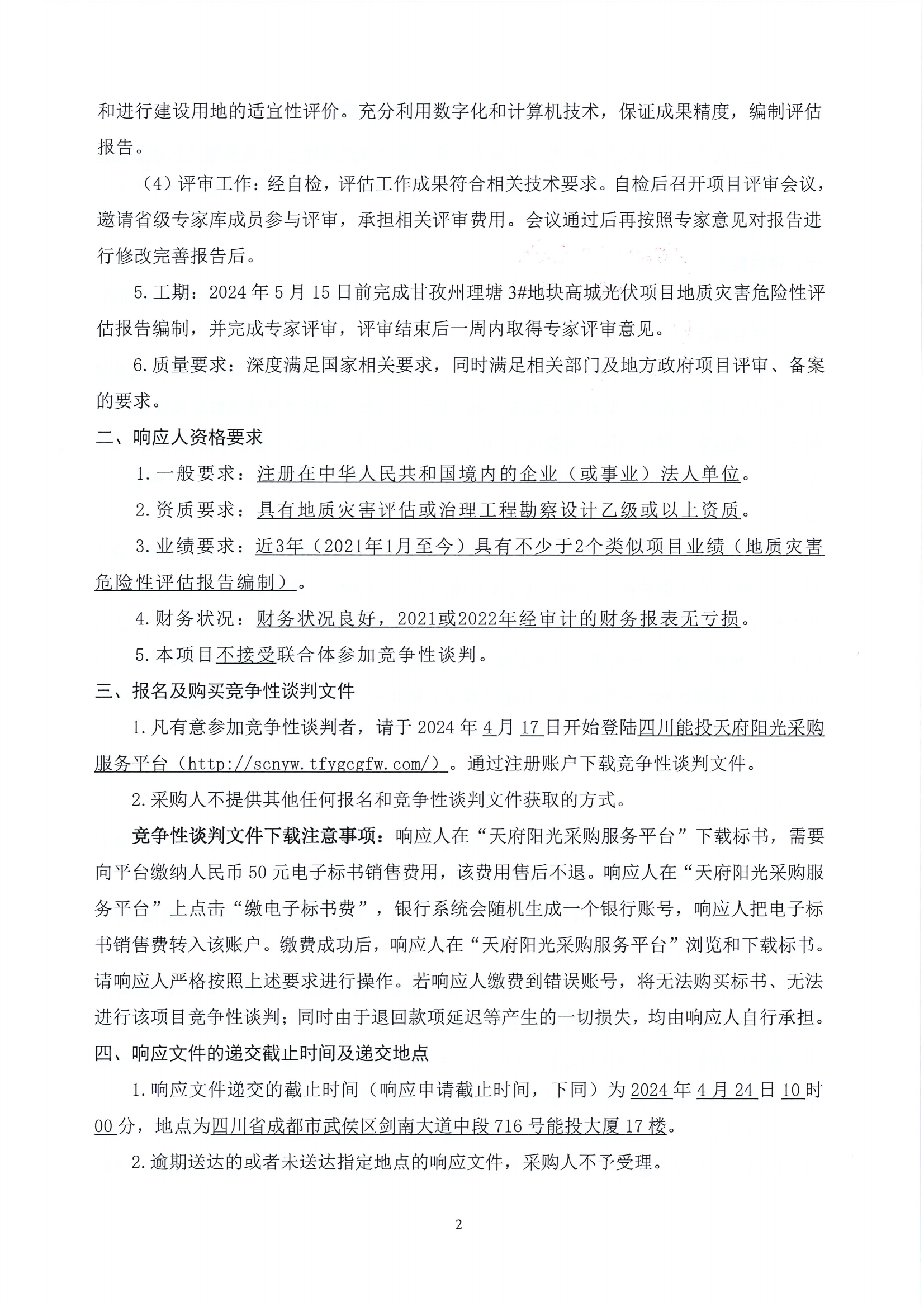 1.凡有意参加竞争性谈判者,请于2024年4月17日开始登陆四川能投天府阳光采购服务平台(http://scnyw.tfygcgfw.com/)。通过注册账户下载竞争性谈判文件。